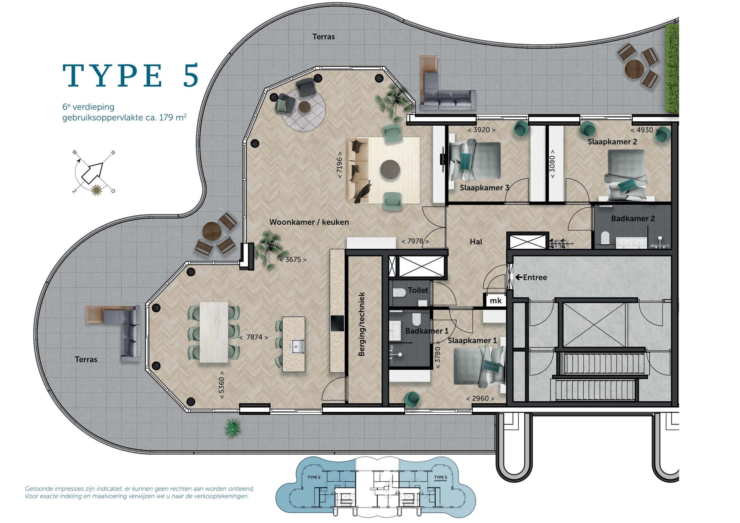 Van 3-kamer appartementen van ca. 94 m2 tot riante penthouses van ca. 179 m2. Voor ieder wat wils. In elk appartement zijn de ramen verdiepingshoog, ideaal om heel veel daglicht binnen te halen en optimaal te kunnen genieten van het weids uitzicht over land en zee. Bijzonder is ook de hoeveelheid buitenruimte, aan de ene kant vrij zicht over de voormalige handelshaven en de Westerschelde, aan de andere kant een groene parkachtige omgeving op de Middenhavendam. Daarbij heeft elk appartement een eigenriante buitenruimte in de vorm van een groot balkon of terras.