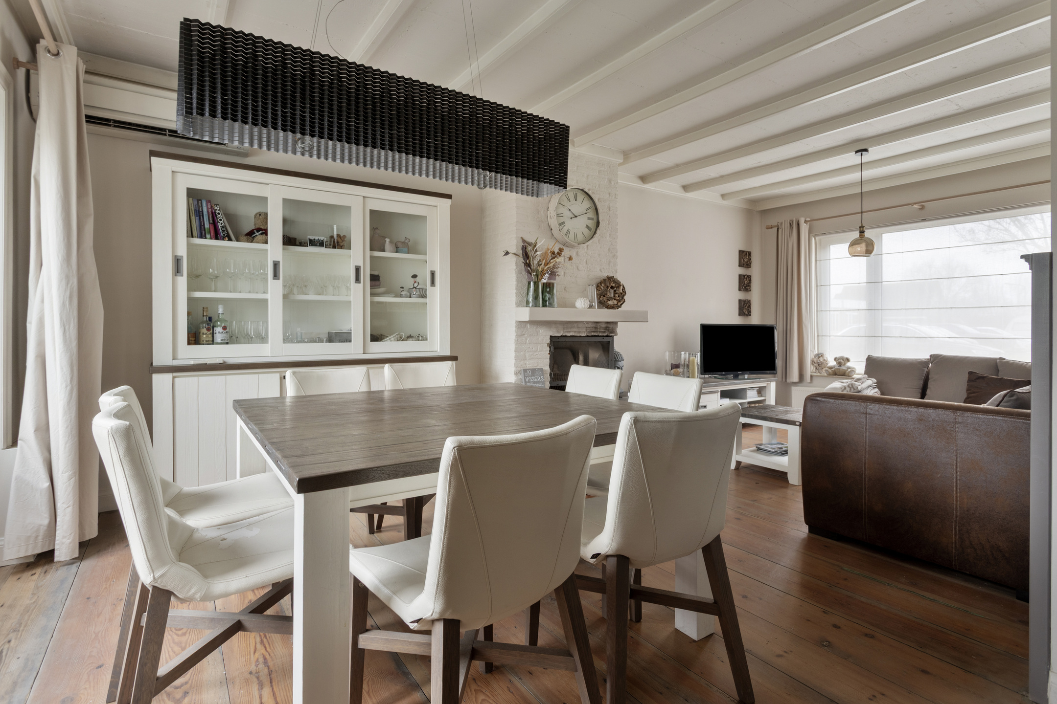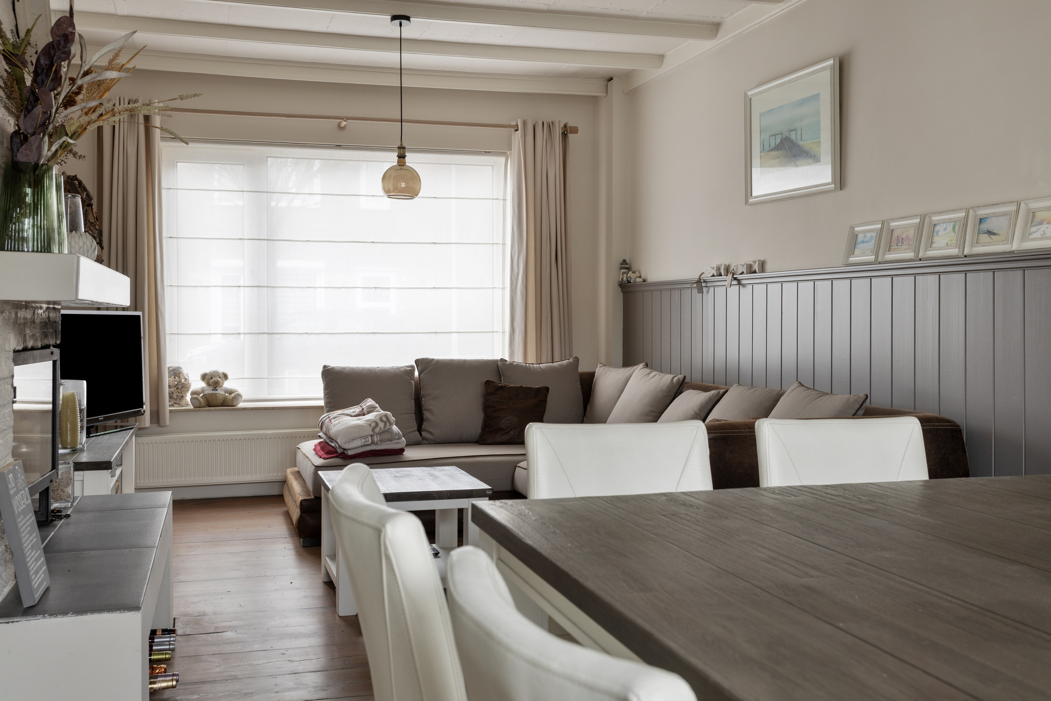 * woonkamer met houtkachel en airco;