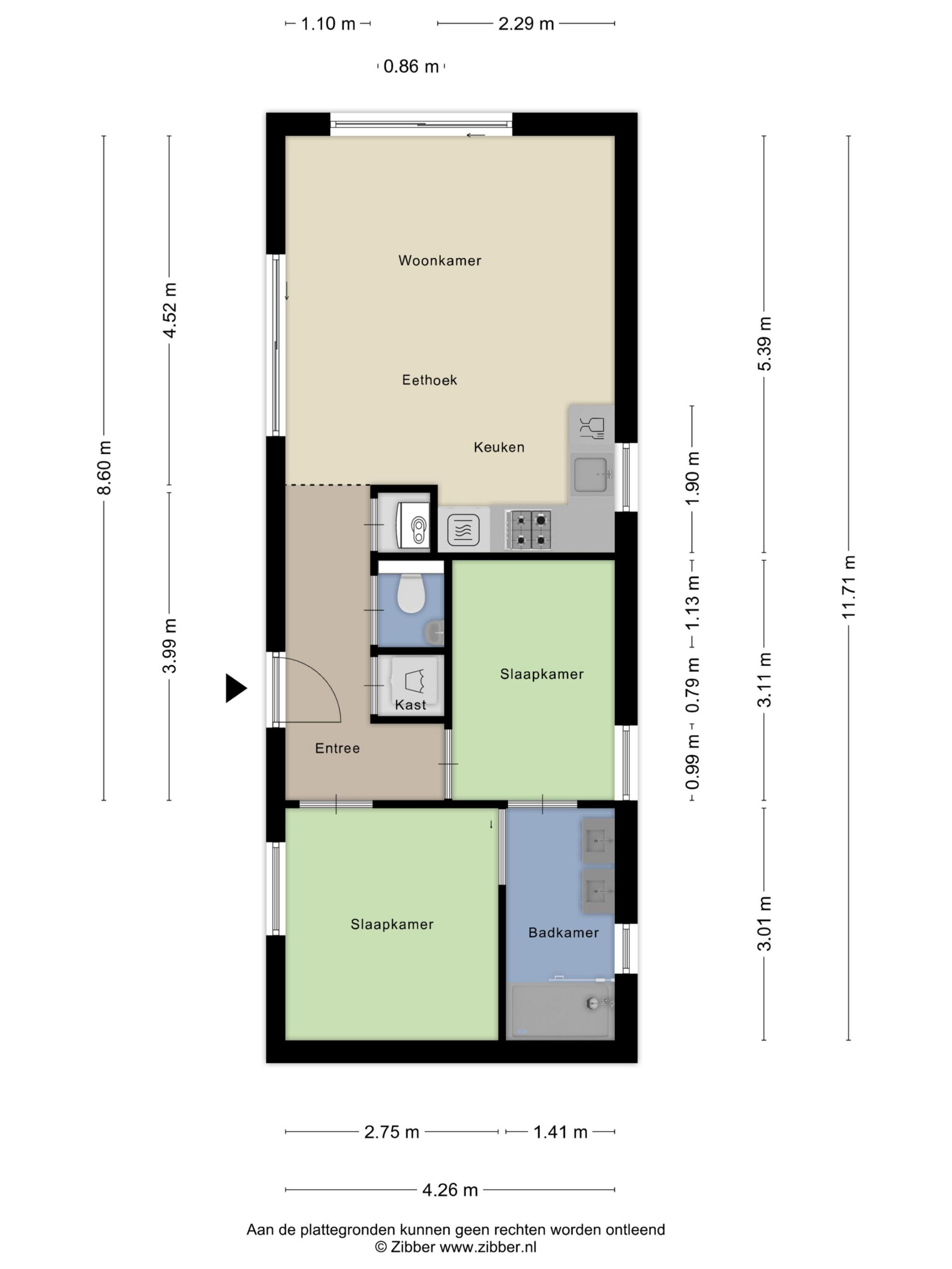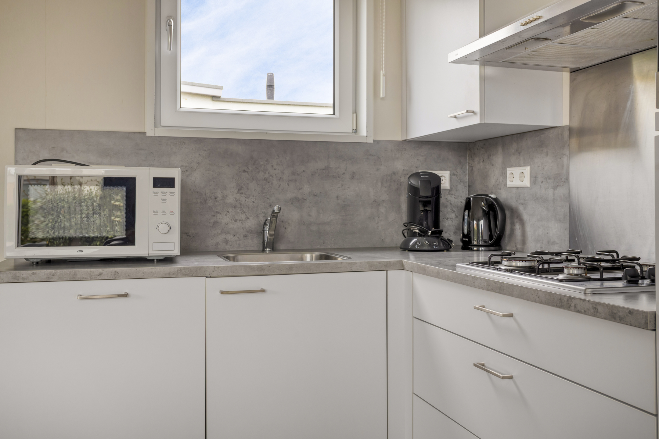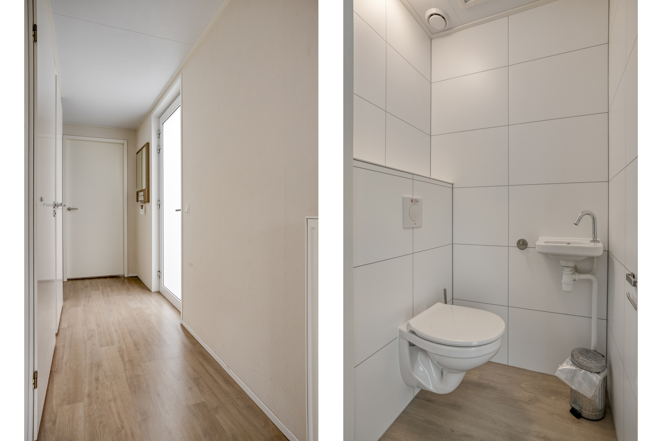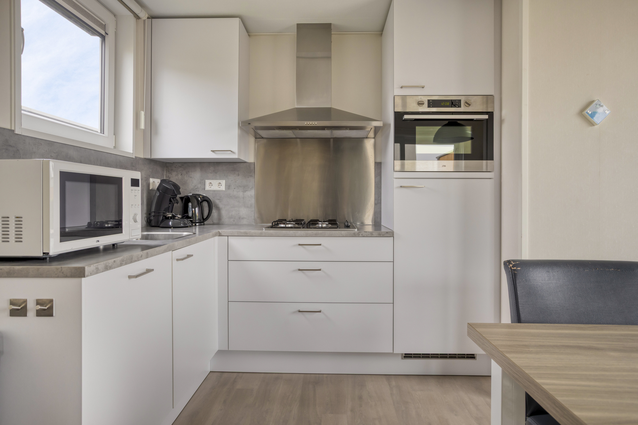 U komt binnen in de hal met toegang tot alle vertrekken. Aan de linkerzijde bevindt zich de woonkamer met open keuken, voorzien van inbouwapparatuur zoals een 4-pits gaskookplaat, afzuigkap, koelkast, combi-oven en vaatwasser. Via de schuifpui heeft u direct toegang tot de tuin.