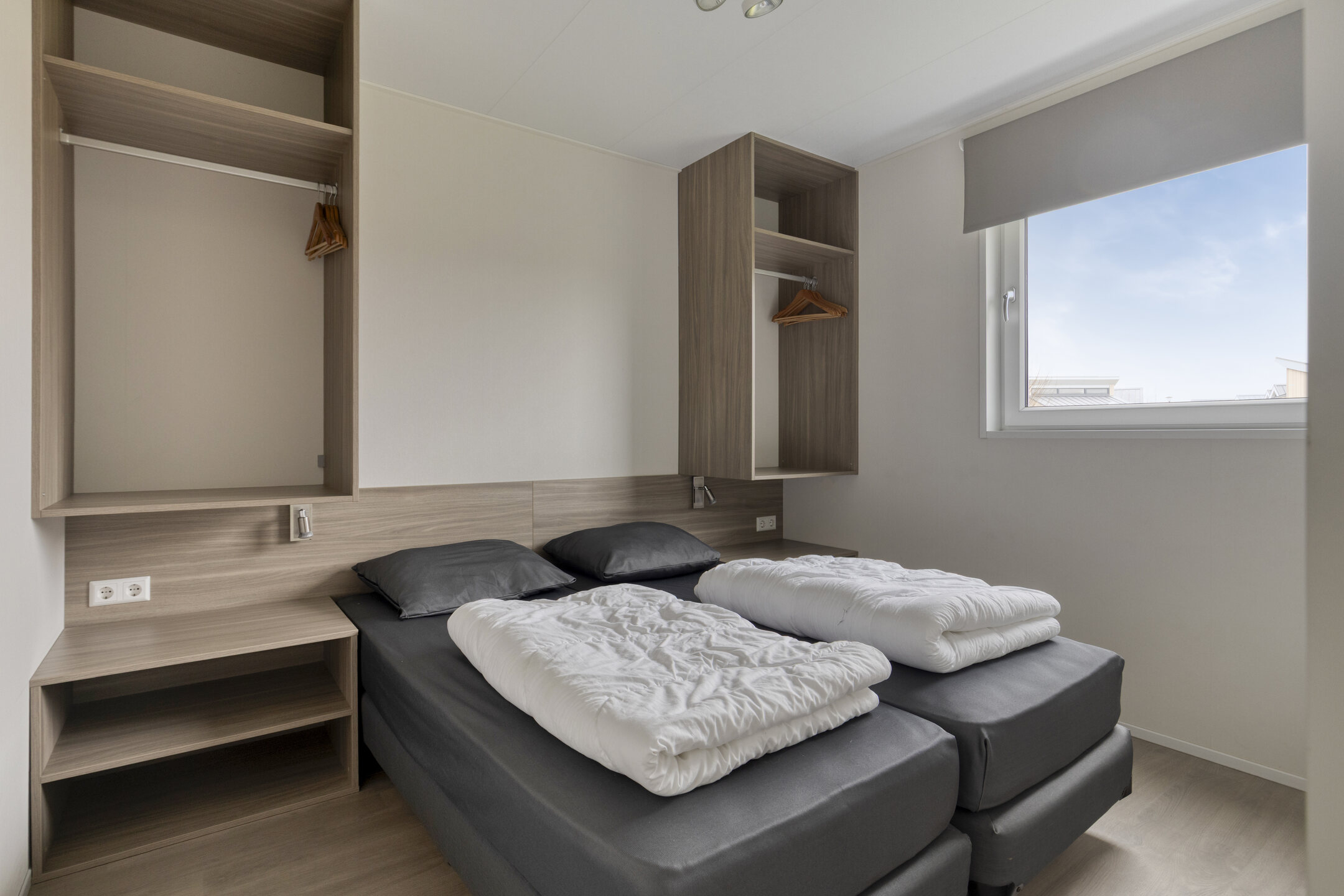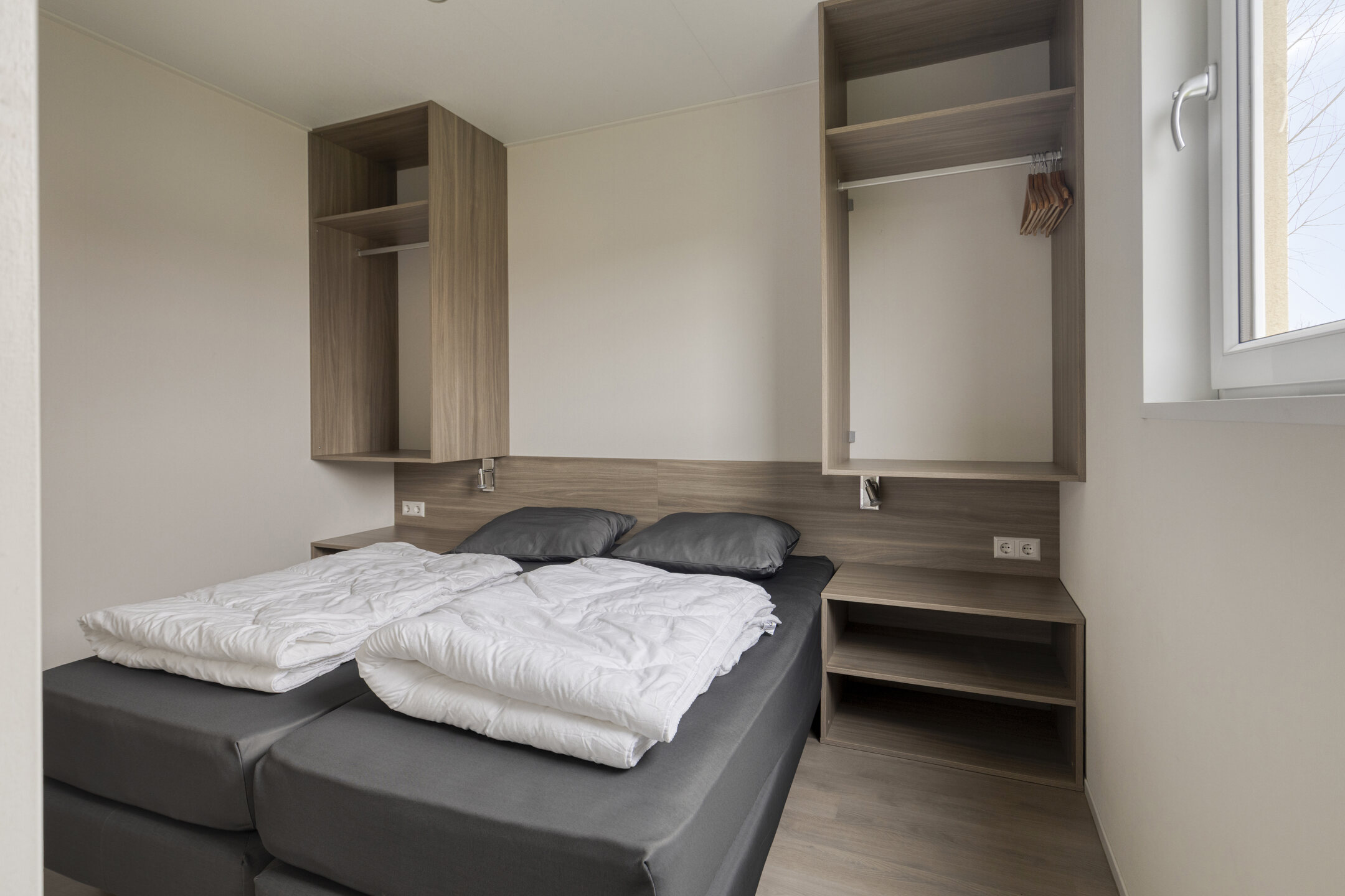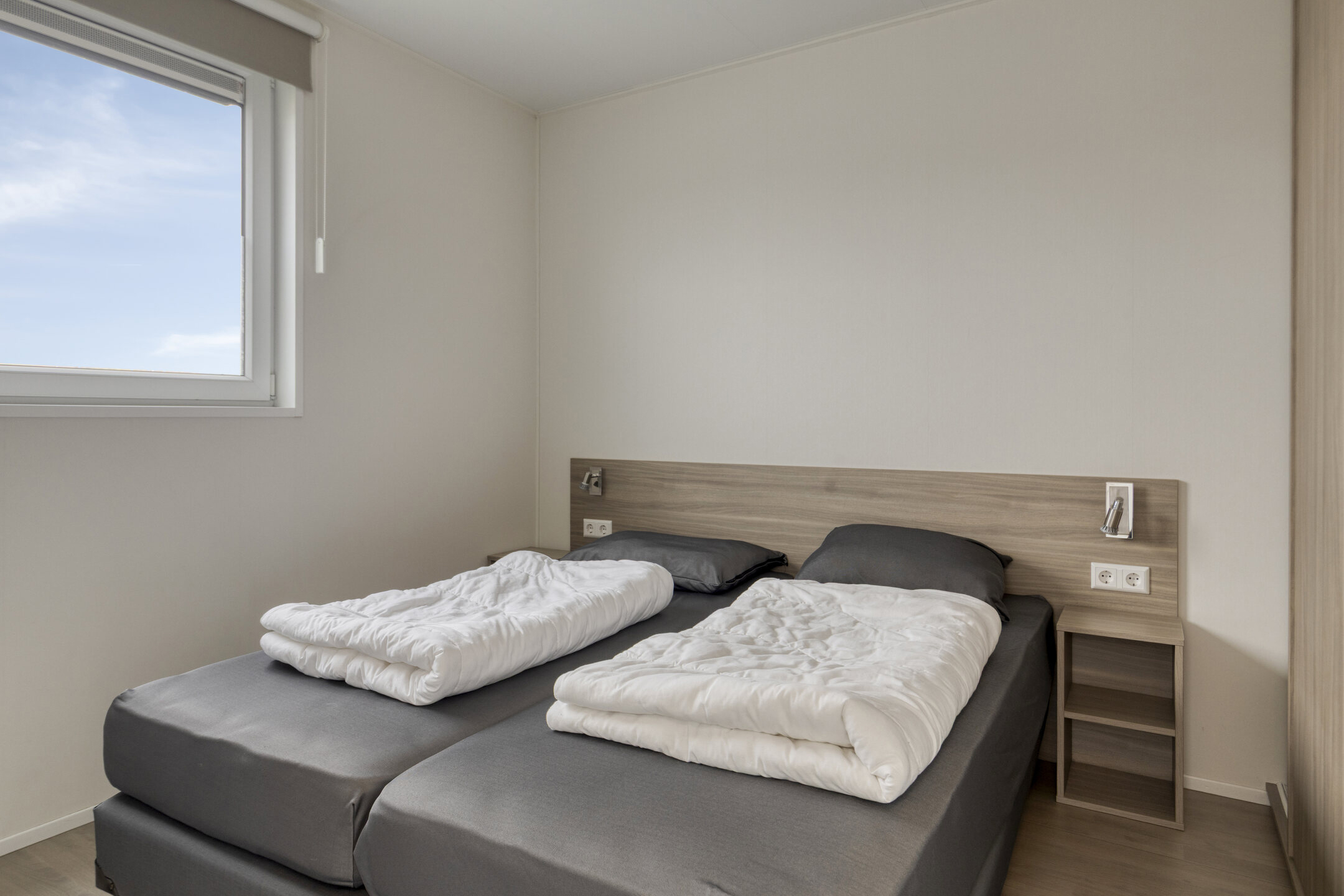 De lodge beschikt over twee ruime slaapkamers die beide zijn voorzien van een badkamer en-suite met douche en wastafelmeubel. Daarnaast is er een separate toiletruimte en een praktische wasruimte met opstelling voor de wasmachine.