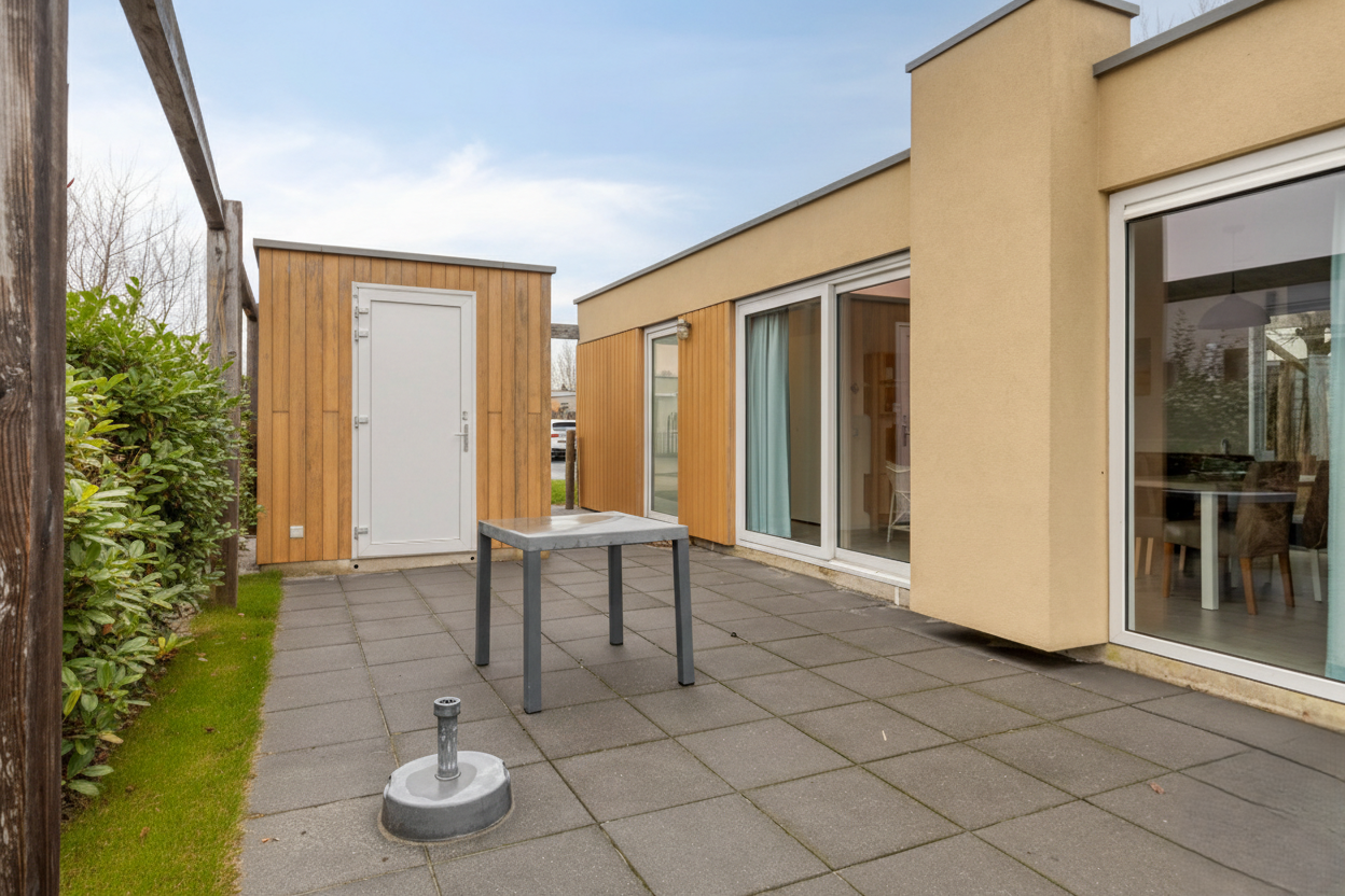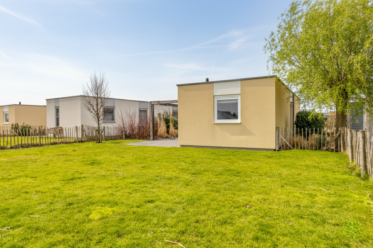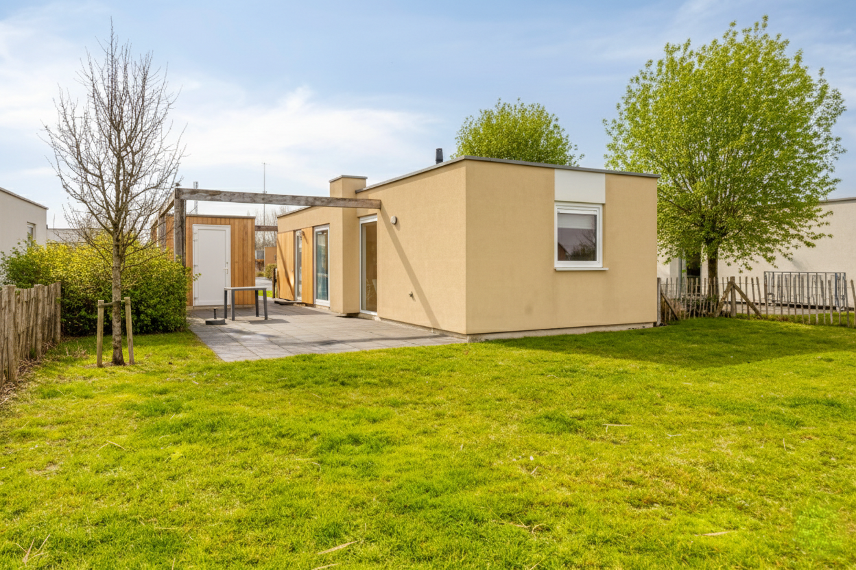 Rondom de woning ligt een ruime tuin waar u optimaal kunt genieten van het buitenleven. Het terras is een fijne plek om buiten te eten of te ontspannen. De tuin grenst direct aan het water, wat zorgt voor een prachtig vrij uitzicht en een rustgevende sfeer. Verder beschikt de lodge over een eigen parkeerplaats op het perceel en een houten tuinhuis voor extra bergruimte.
