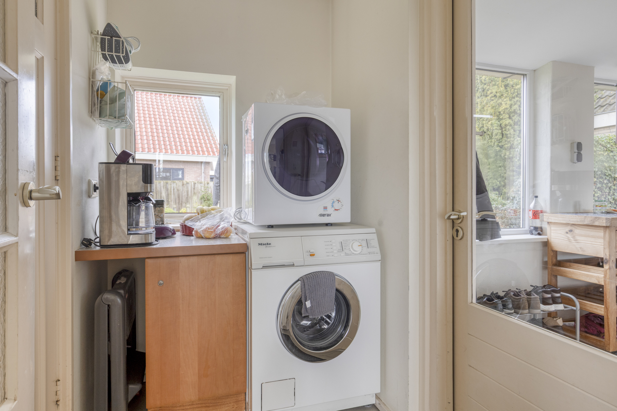 De gesloten keuken is een gezellige plek in huis, mede dankzij de sfeervolle houtkachel en ruimte voor een knusse zithoek. De keuken is compleet uitgerust met inbouwapparatuur: een 4-pits gaskookplaat, afzuigkap, oven, koelkast, vriezer en vaatwasser. Vanuit de keuken loopt u door naar de bijkeuken, die toegang geeft tot de eerste badkamer en de serre. Deze badkamer op de begane grond is voorzien van een douche, wastafel en toilet. De lichte serre vormt de perfecte overgang naar het buitenleven.