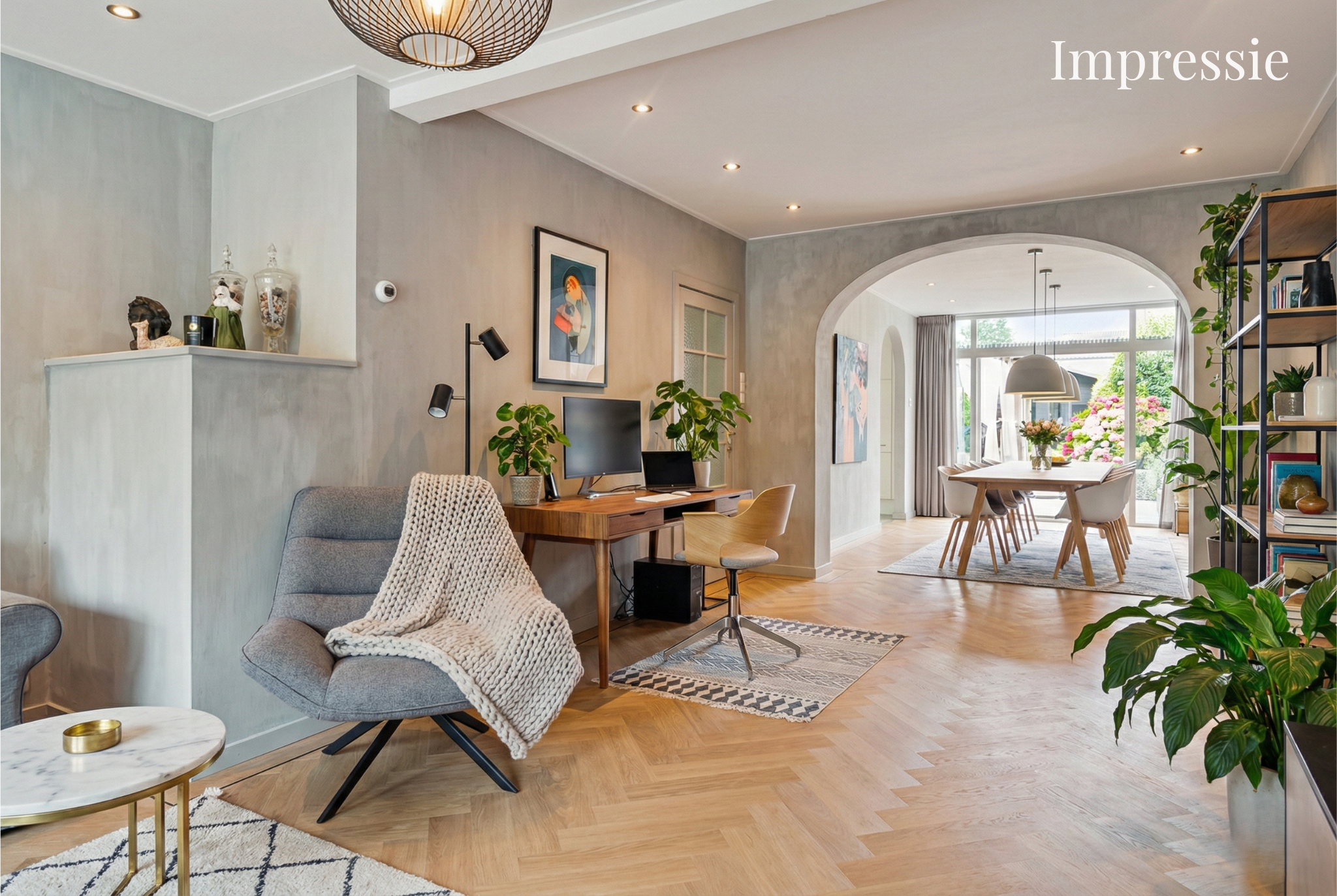 Bij binnenkomst treft u een ruime hal die toegang biedt tot de badkamer, uitgerust met een douche, toilet en wastafelmeubel. Vervolgens komt u in de lichte en ruime woonkamer, voorzien van een gezellige open haard en een stijlvolle parketvloer. De open keuken, uitgerust met hoogwaardige inbouwapparatuur zoals een 6-pits gaskookplaat, koelkast, vaatwasser, afzuigkap en een combi oven/magnetron, maakt deze ruimte ideaal voor gezellige diners en familieavonden. Vanuit de woonkamer heeft u middels openslaande deuren direct toegang tot de achtertuin.