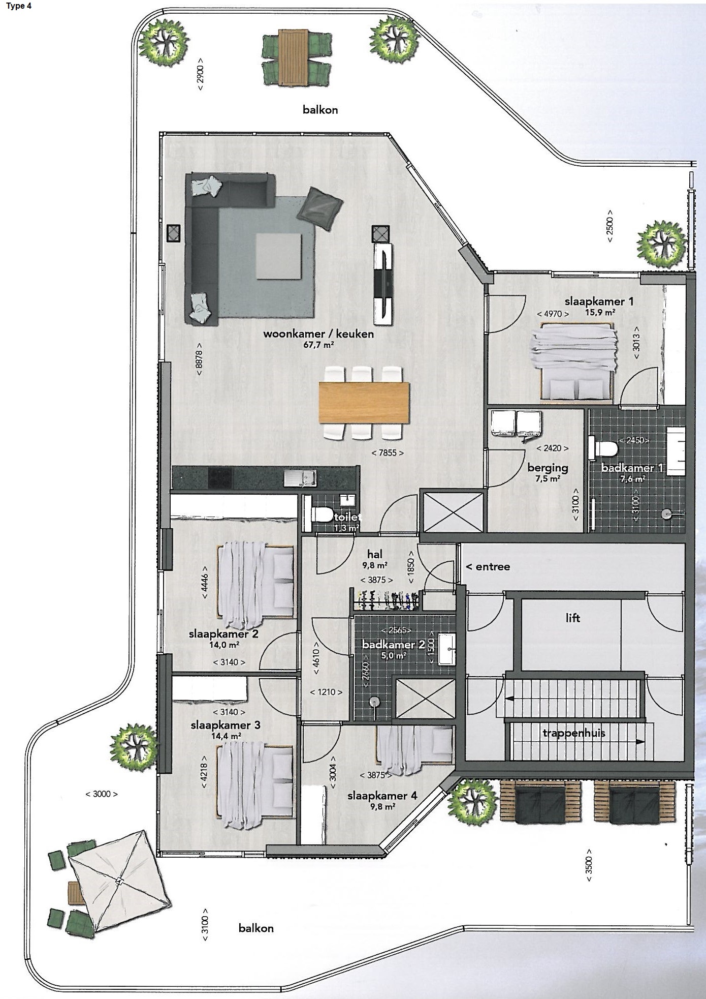 Type 4 gelegen aan zee- en havenzijde, met 4 slaapkamers
