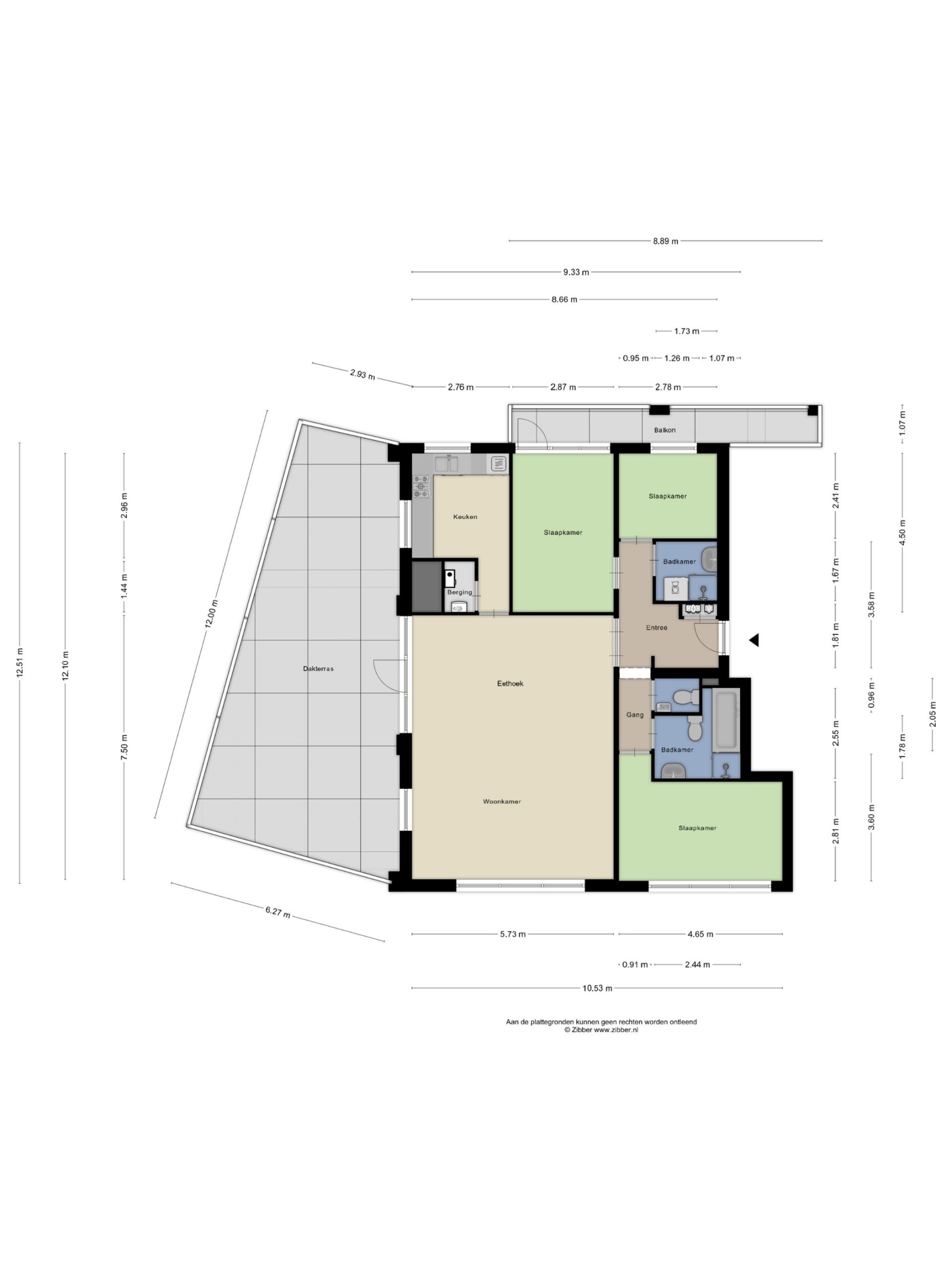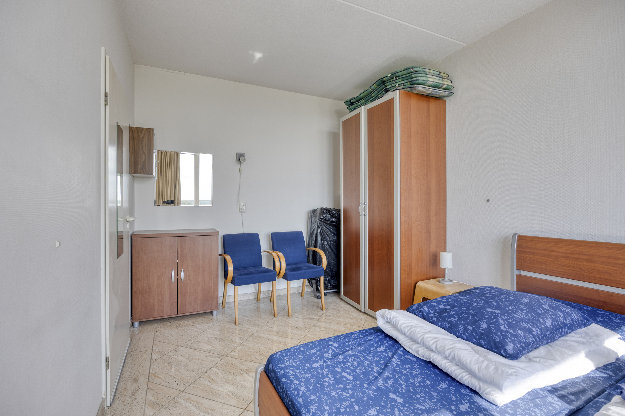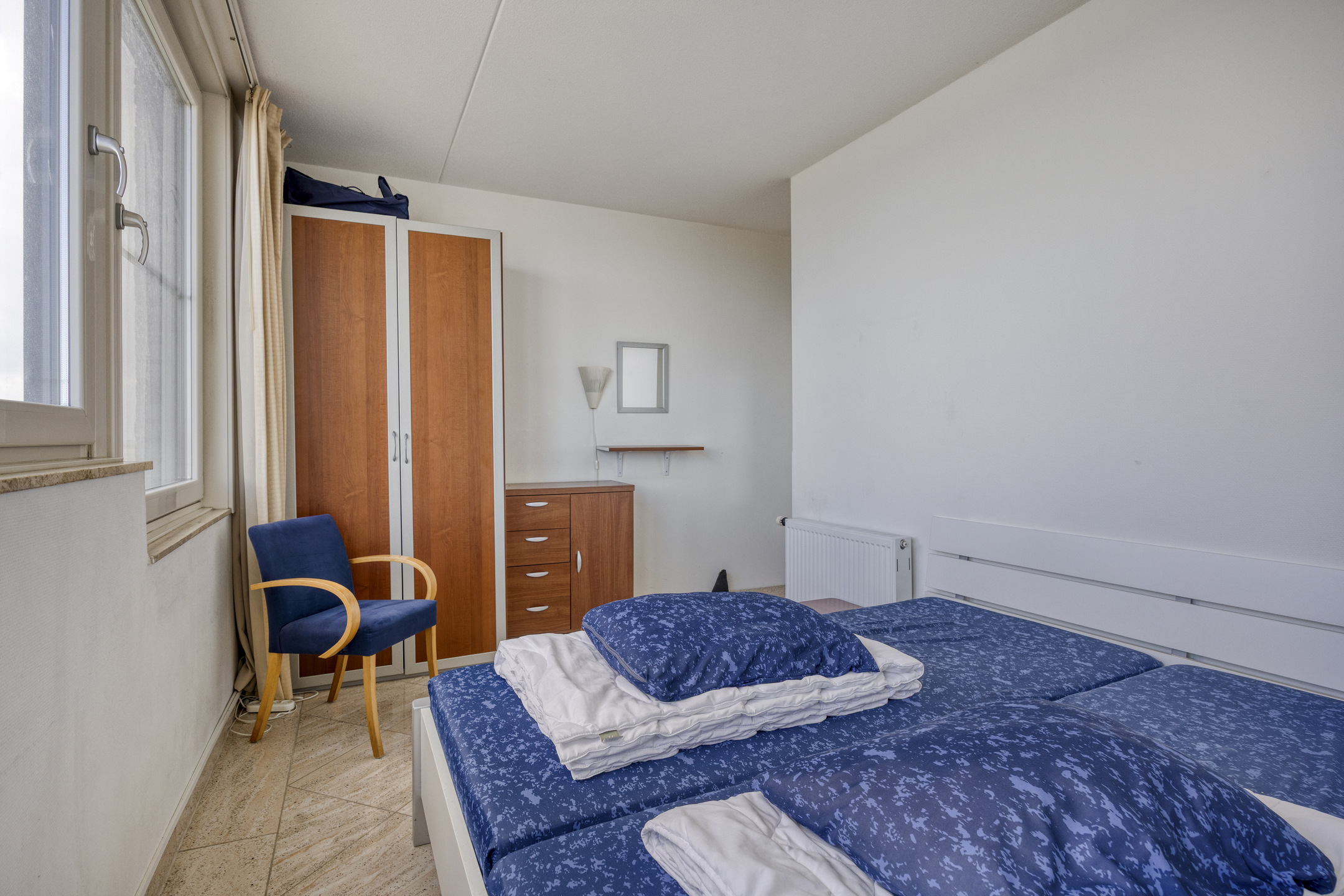 Het appartement beschikt over drie slaapkamers. Eén van de kamers biedt via een openslaande deur toegang tot het balkon aan de landzijde. Daarnaast zijn er twee badkamers aanwezig. De badkamer aan de landzijde is voorzien van een douche, toilet, wasmachineaansluiting en wastafel, terwijl de badkamer aan de zeezijde beschikt over een ligbad, douche, toilet en wastafel.