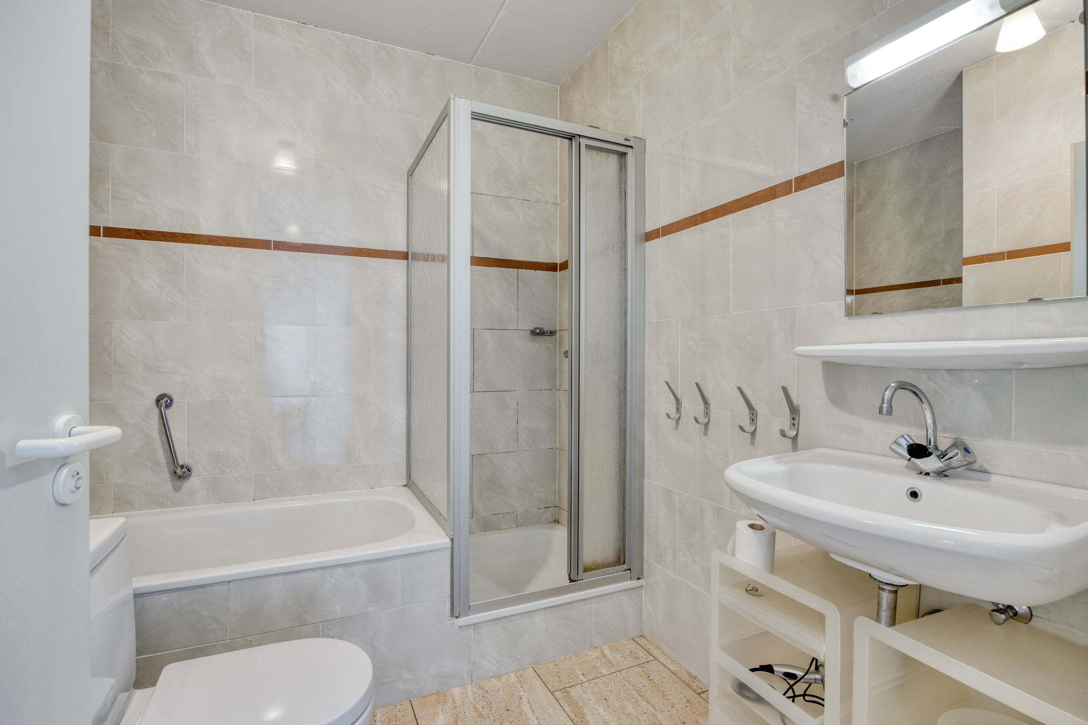 - Badkamervoorzieningen Douche, wastafel, wasmachineaansluiting, ligbad, toilet, douche, wastafel