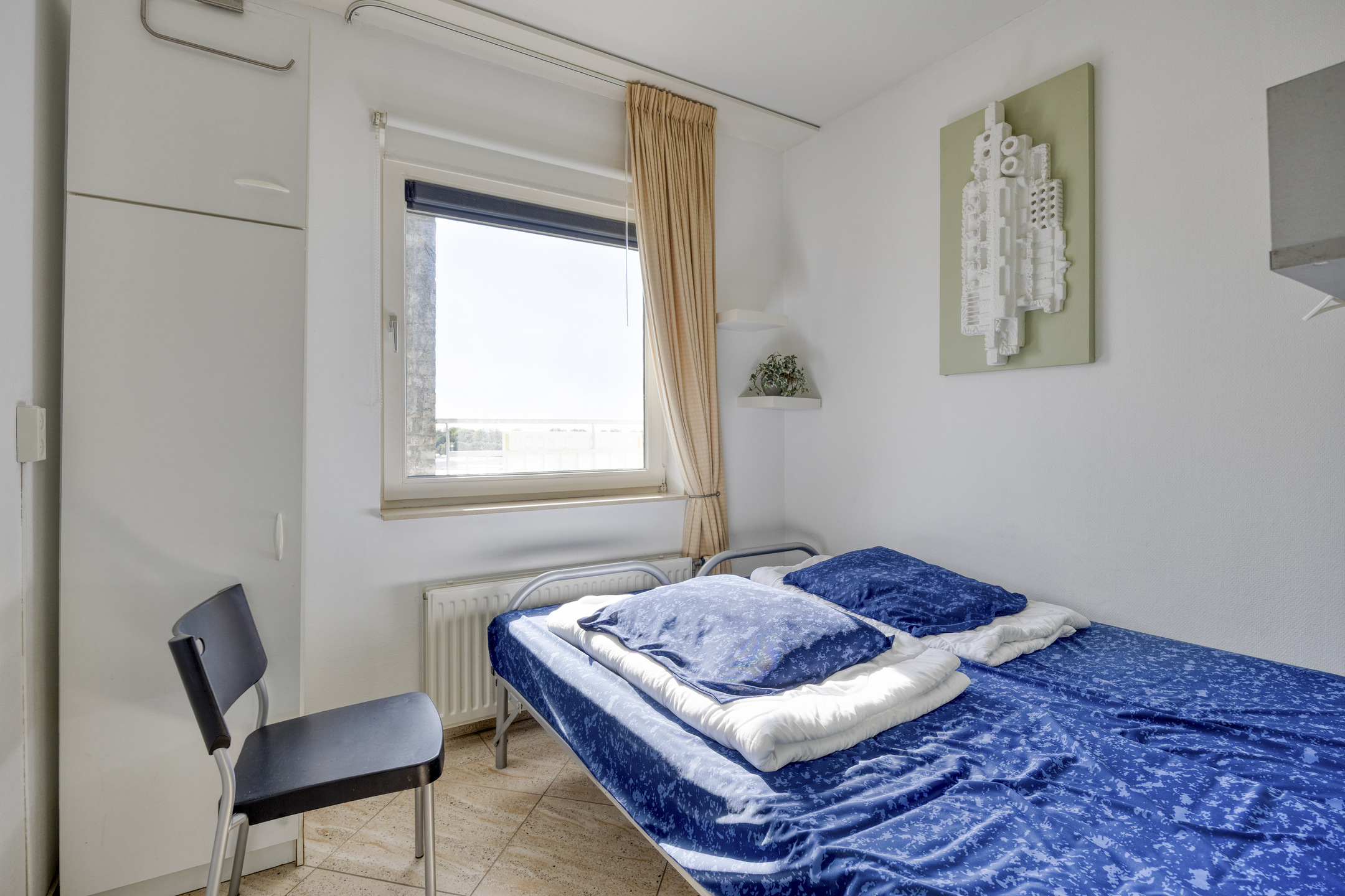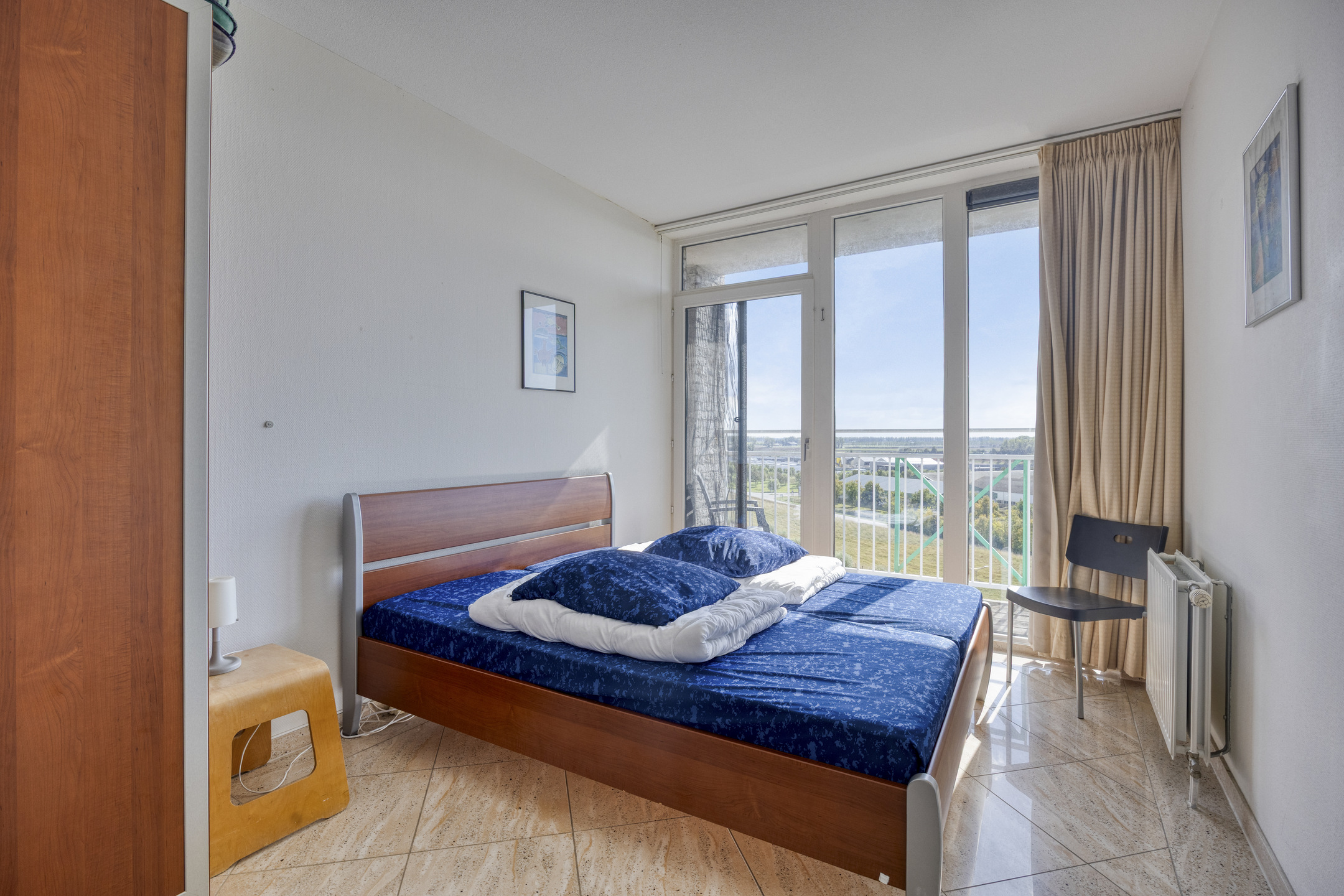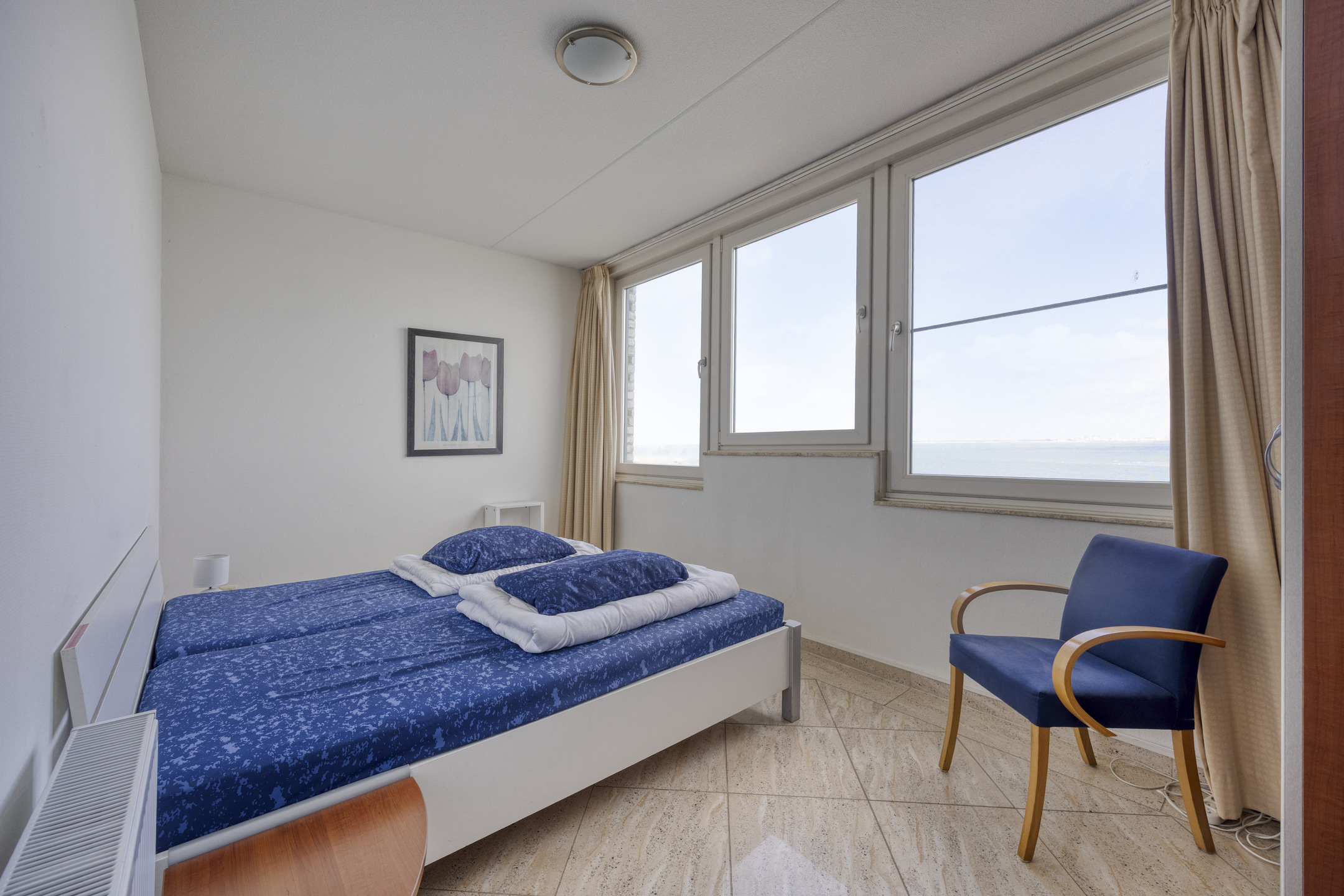 Het appartement beschikt over drie slaapkamers. Eén van de kamers biedt via een openslaande deur toegang tot het balkon aan de landzijde. Daarnaast zijn er twee badkamers aanwezig. De badkamer aan de landzijde is voorzien van een douche, toilet, wasmachineaansluiting en wastafel, terwijl de badkamer aan de zeezijde beschikt over een ligbad, douche, toilet en wastafel.