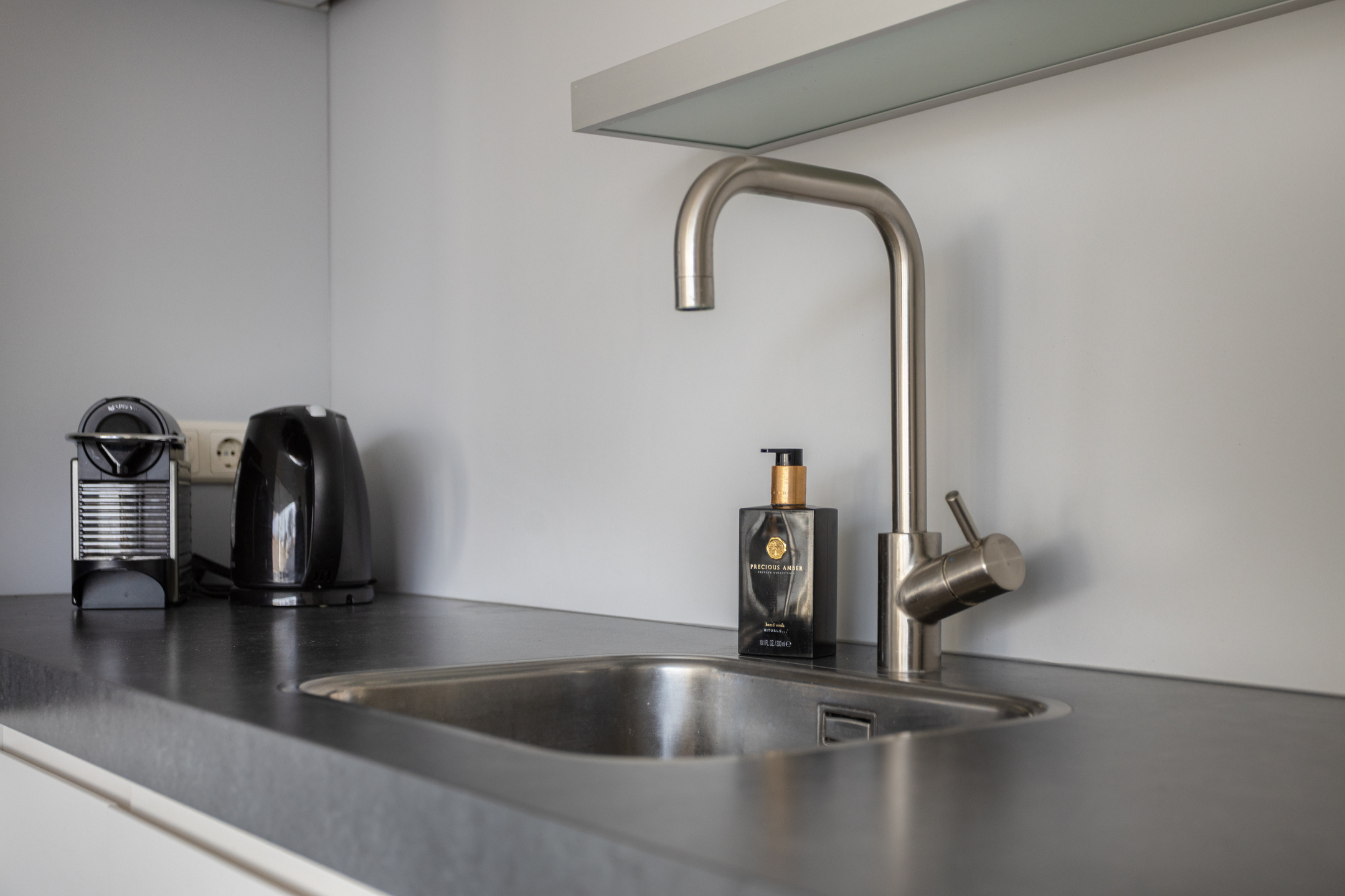 De keuken is uitgerust met diverse inbouwapparatuur, waaronder een inductiekookplaat, afzuigkap, combi-oven, koelkast en vaatwasser. Vanuit de keuken heeft u middels een deur toegang tot de garderobe.