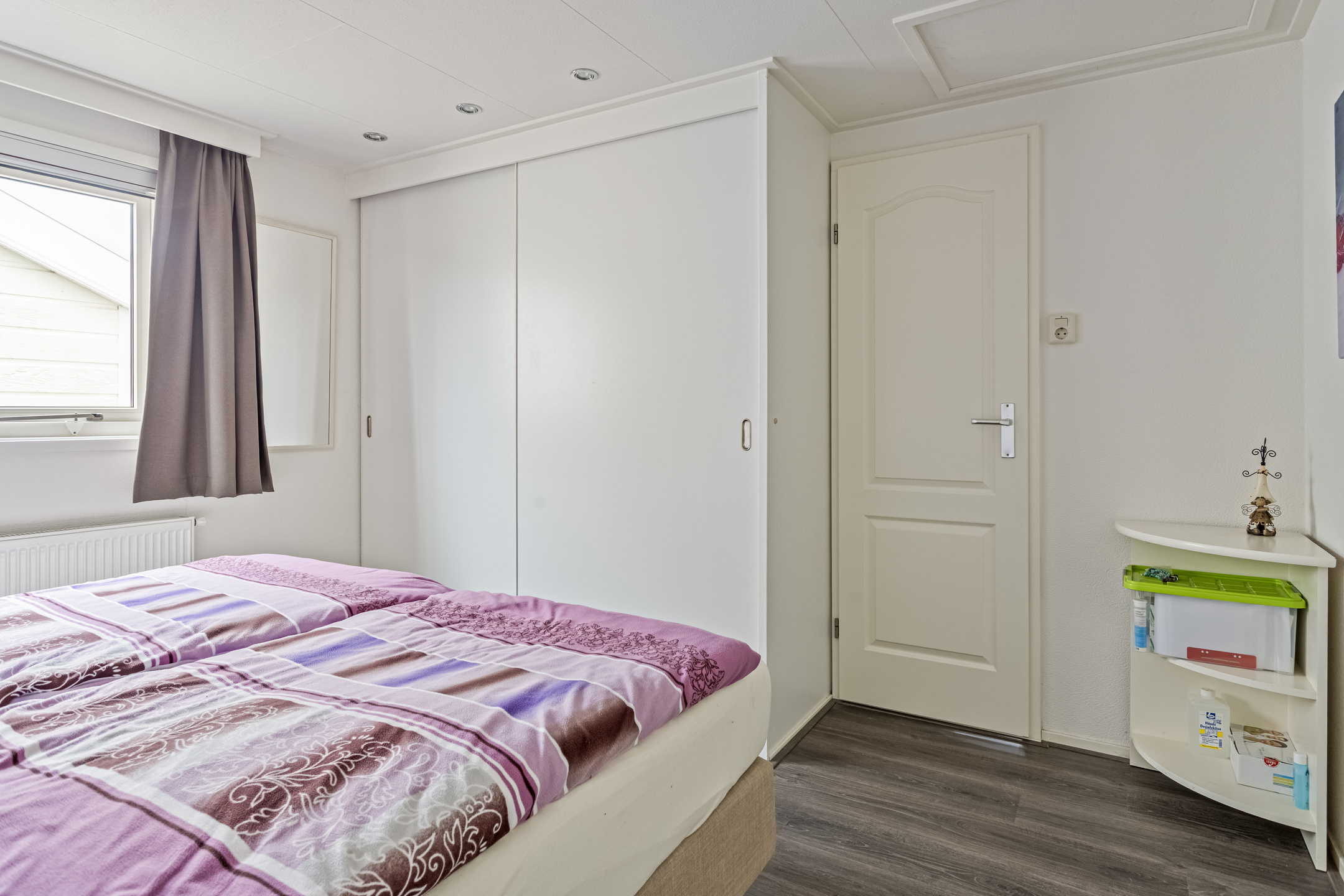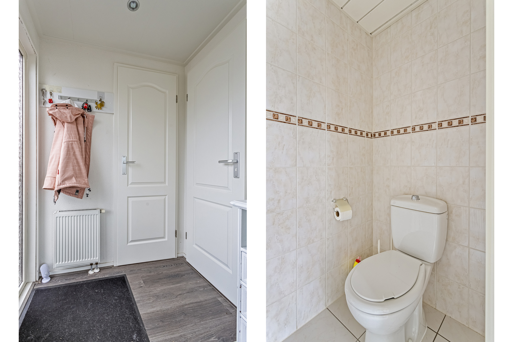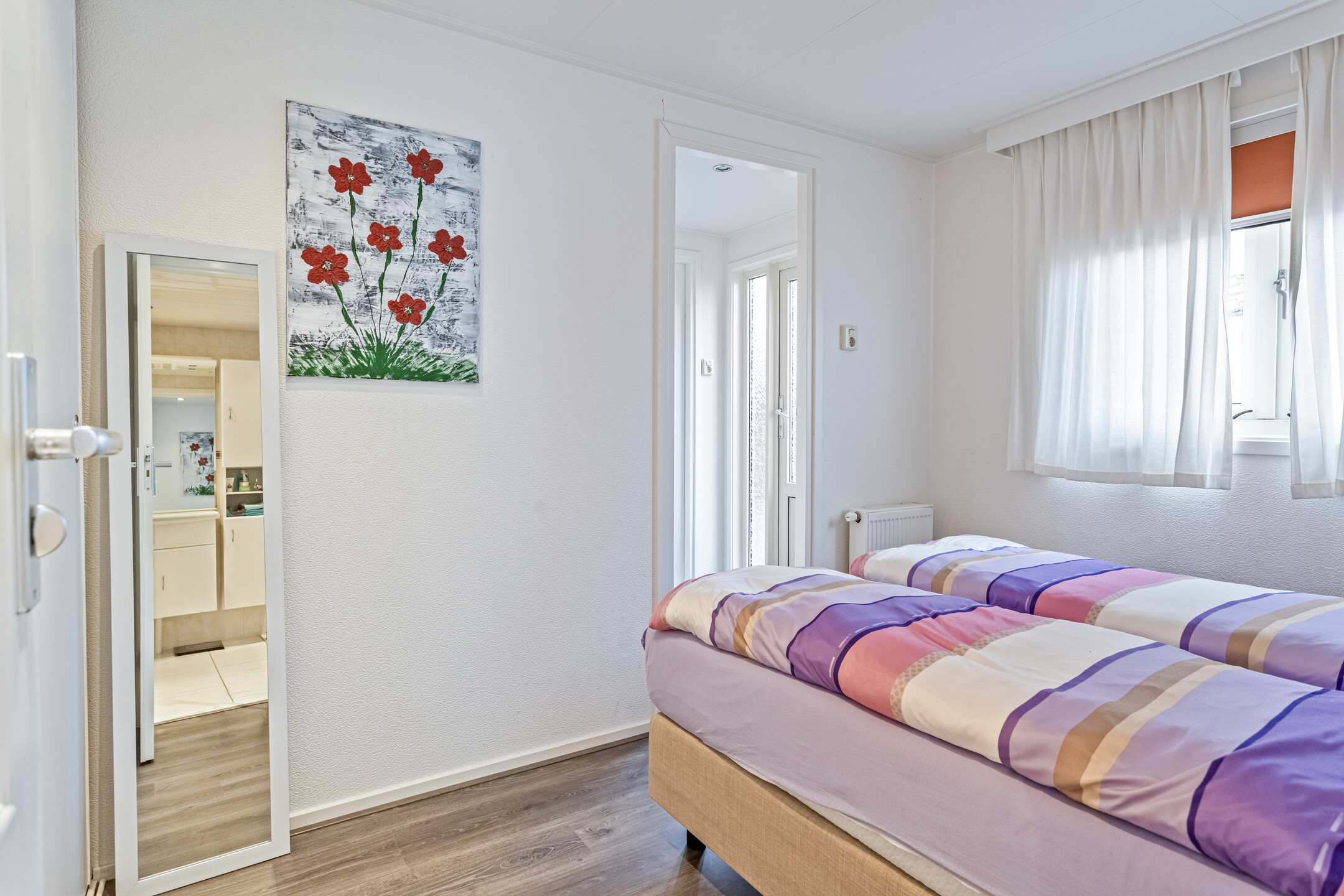 Het chalet beschikt over twee comfortabele slaapkamers. De badkamer is voorzien van een douche, wastafel en toilet. Daarnaast is er een handige bijkeuken met extra bergruimte en een tweede toegang tot buiten. Vanuit de bijkeuken is de badkamer eveneens bereikbaar, wat bijzonder praktisch is na een dag op het strand.