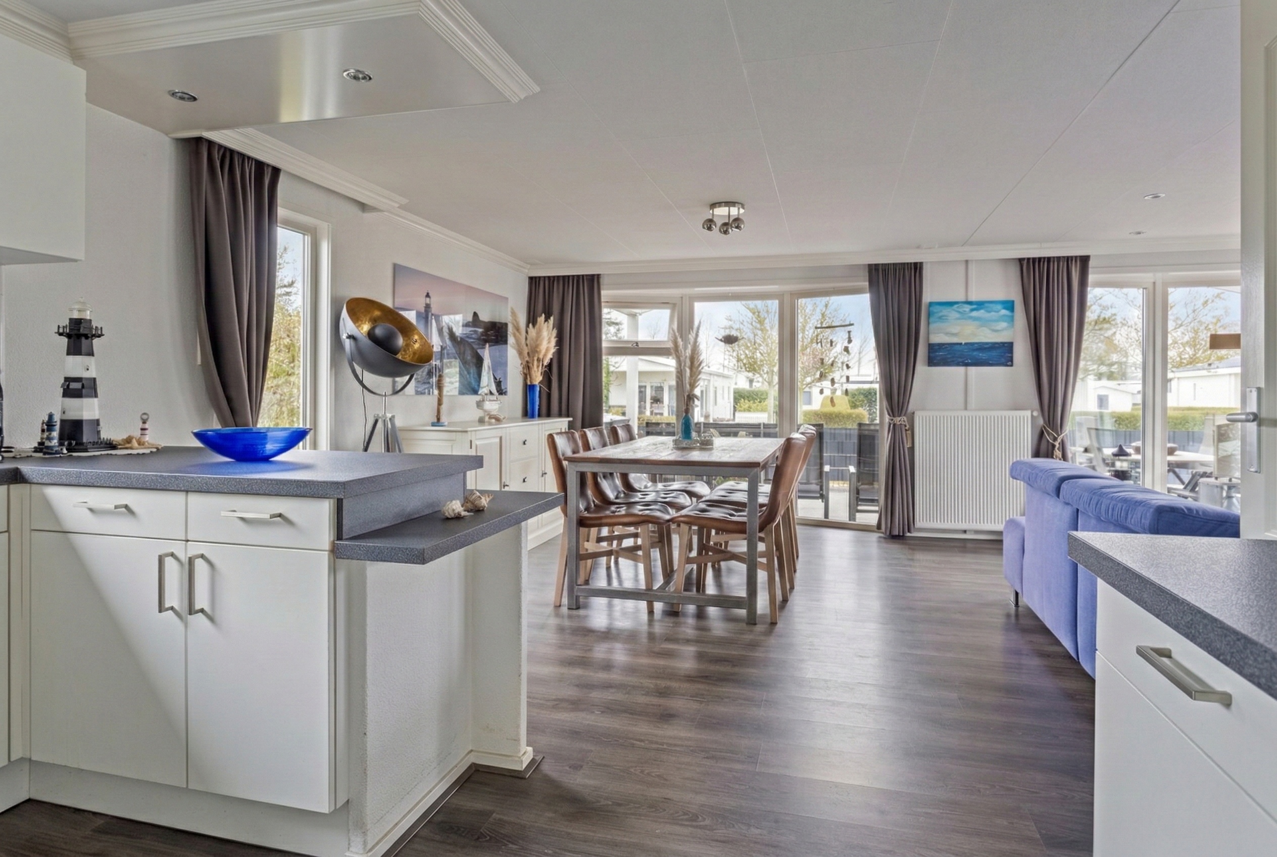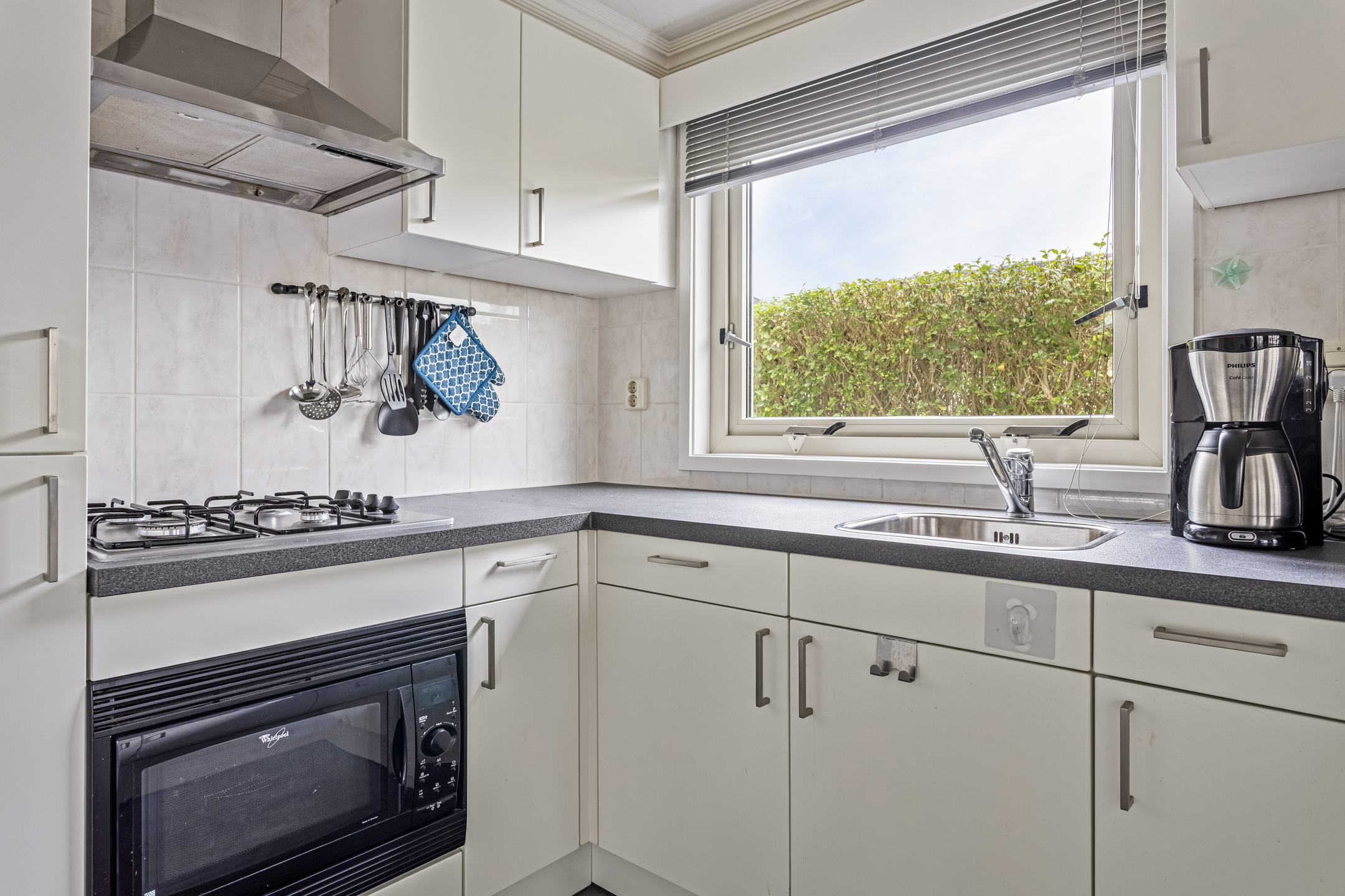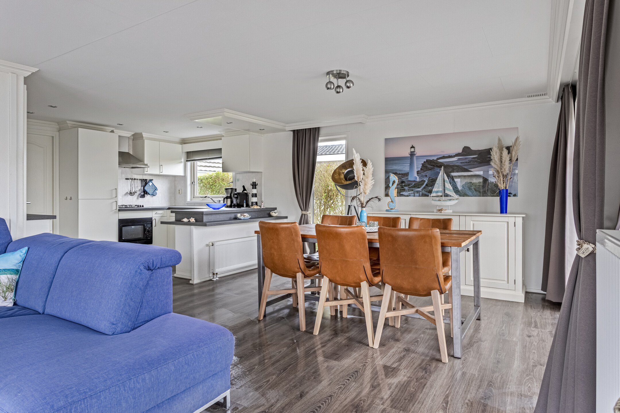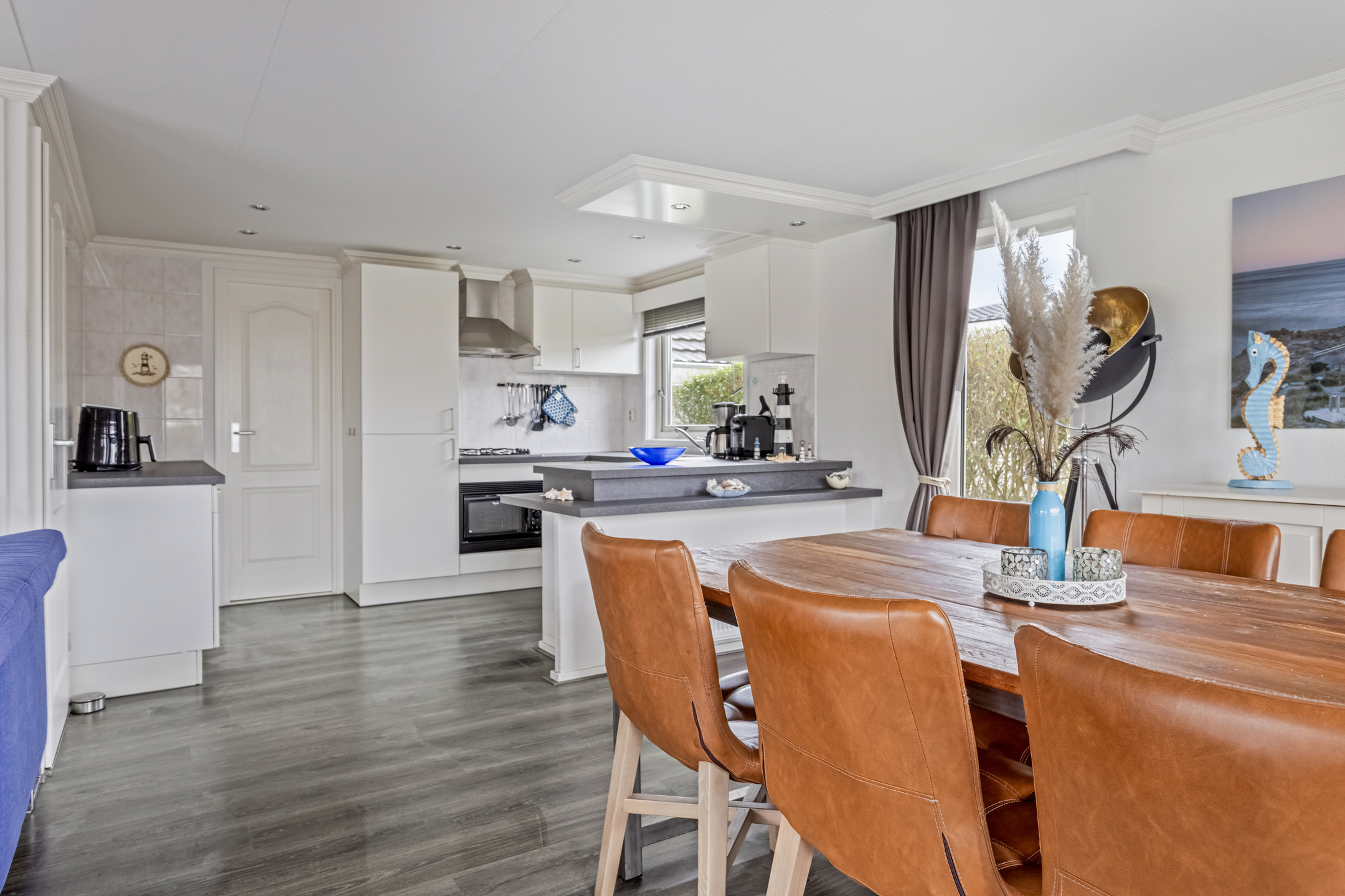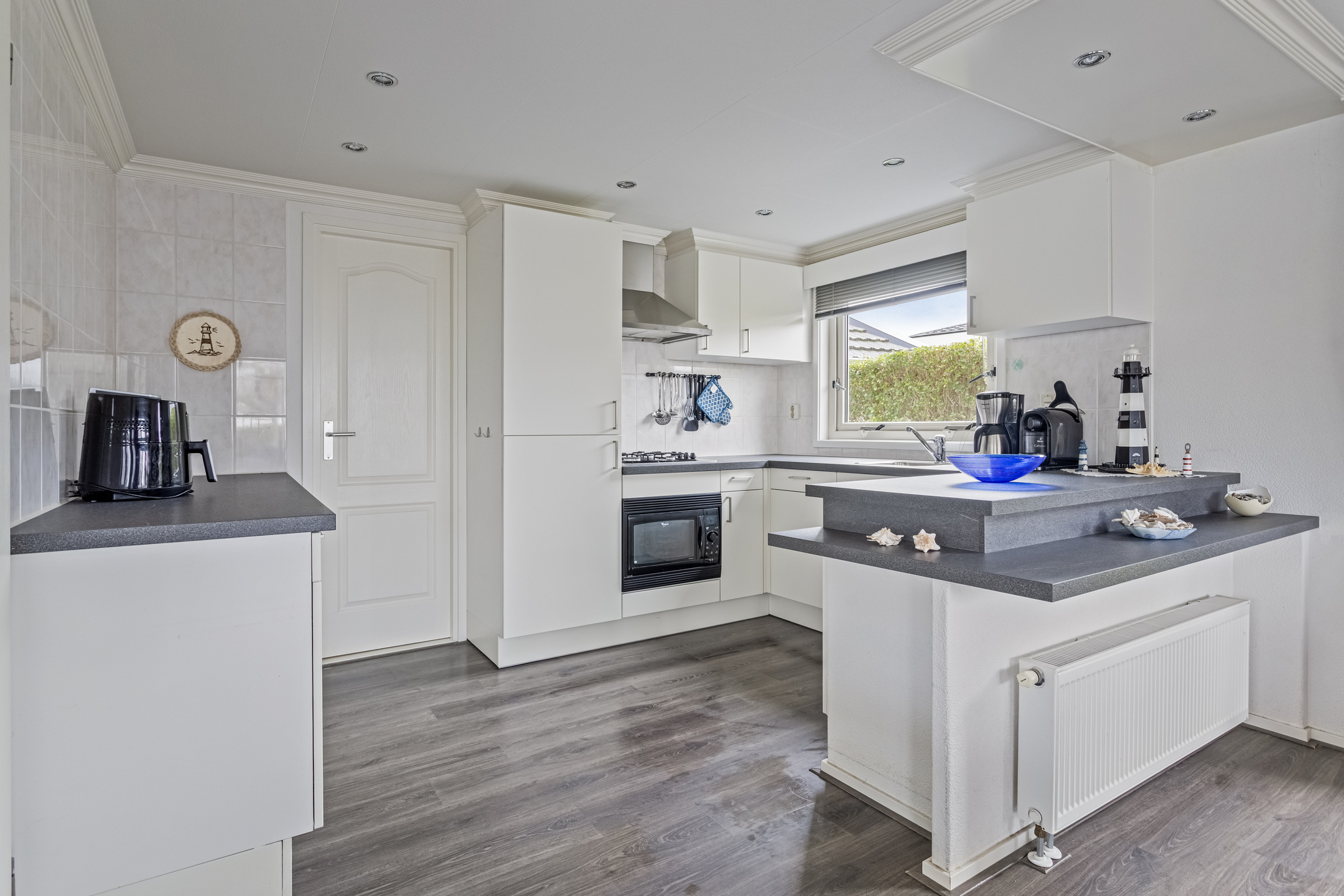 De nette open keuken sluit naadloos aan op de woonkamer en is uitgerust met diverse inbouwapparatuur, waaronder een 4-pits gaskookplaat, afzuigkap, combi-oven, vaatwasser en een diepvries.