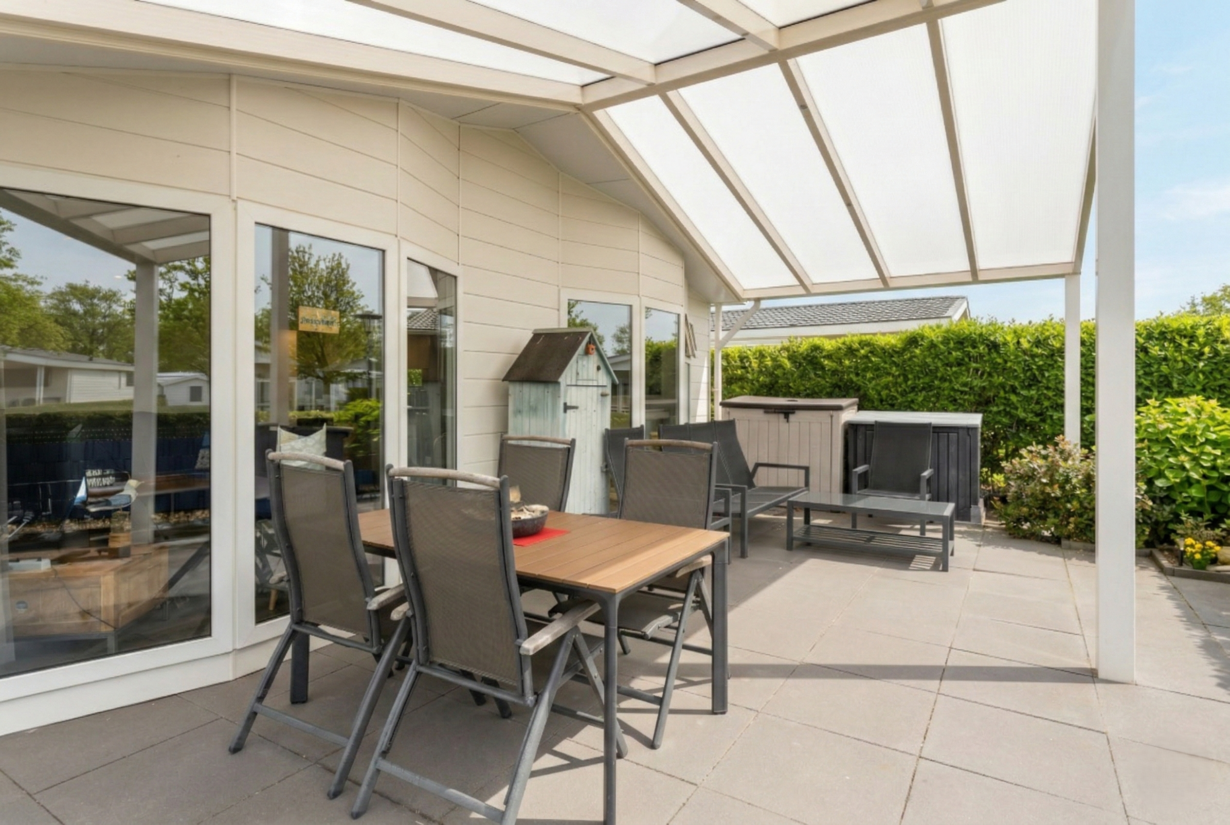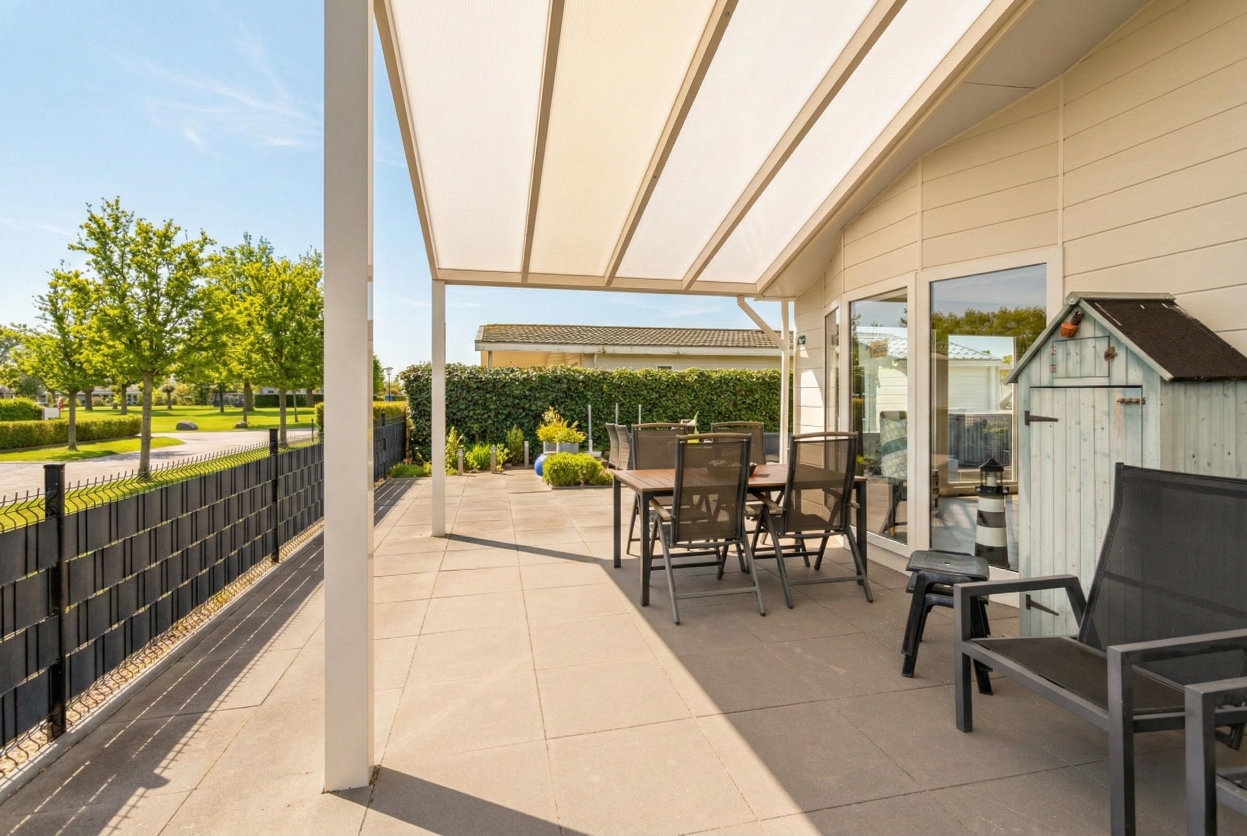 De onderhoudsvriendelijke tuin beschikt over een ruim terras met plaats voor een gezellige zit- en eethoek. Onder de royale overkapping zit u beschut tegen zon en wind. Tevens is er een vrijstaande berging aanwezig voor fietsen en strandspullen. Parkeren doet u eenvoudig op eigen terrein dankzij de dubbele parkeerplaats. De volledige buitengevel is recent vernieuwd en uitgevoerd in duurzame Profex gevelbekleding, wat zorgt voor een moderne en verzorgde uitstraling.