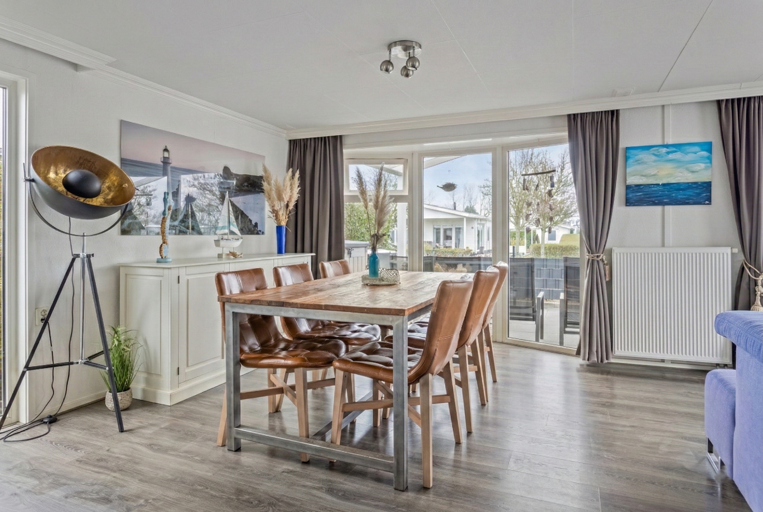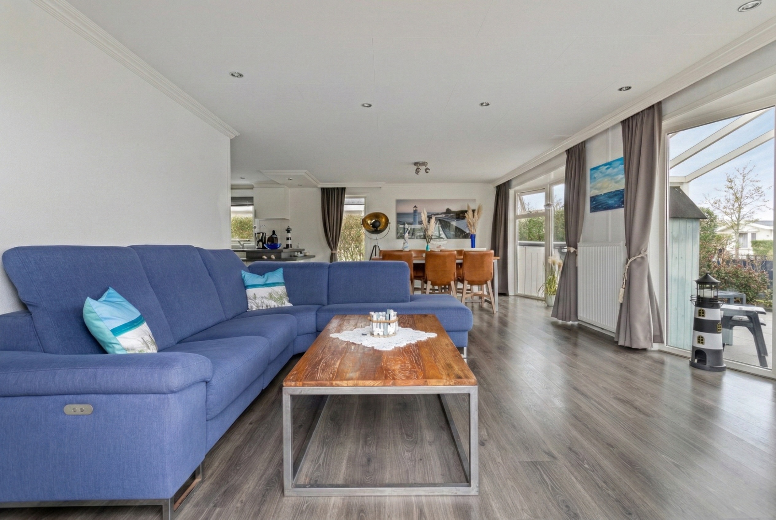 U betreedt de woning via de hal met separate toiletruimte. Vanuit hier heeft u toegang tot de lichte en royale woonkamer, die dankzij de grote raampartijen een prettige sfeer en veel daglicht biedt. Via de schuifpui loopt u direct door naar het overdekte terras, waar u al vroeg in het seizoen comfortabel buiten kunt zitten.
