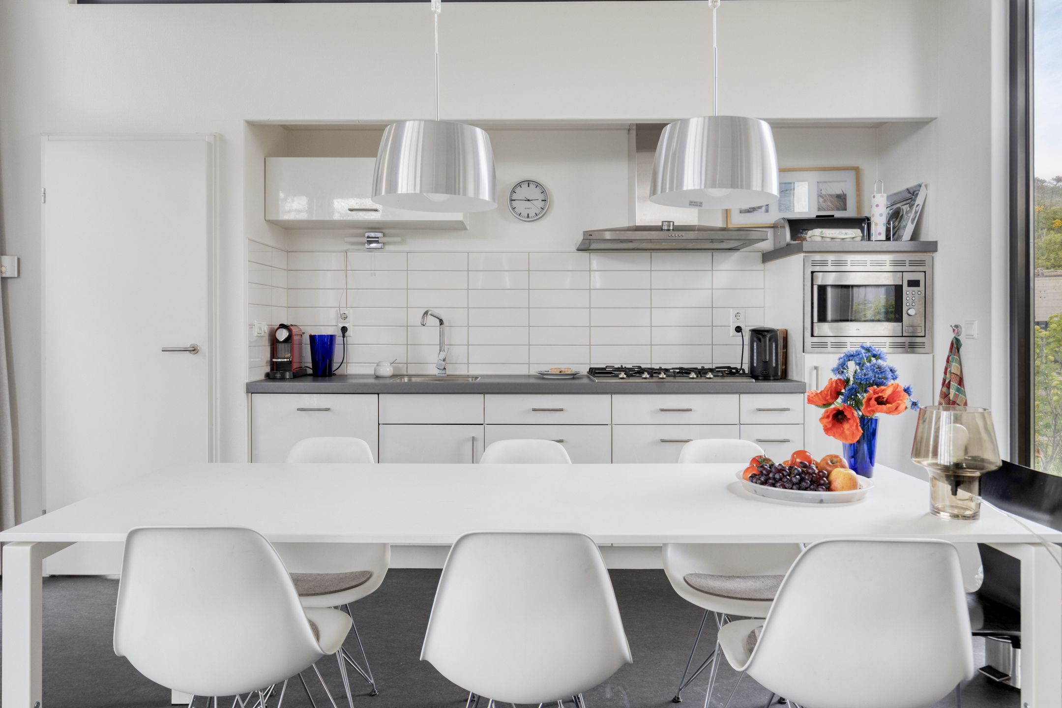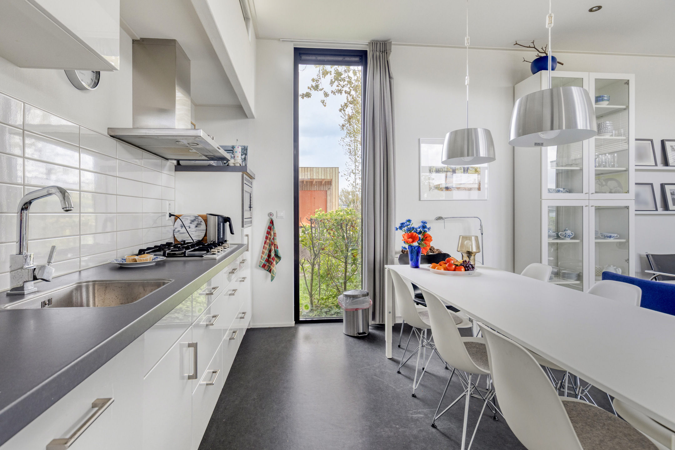 U betreedt de woning via de centrale hal, die een logische verbinding vormt en toegang biedt tot alle overige vertrekken. De ruime, lichte woonkamer beschikt over een sfeervolle gaskachel bij de eethoek, wat ook in het naseizoen voor een warme ambiance zorgt. Middels de openslaande tuindeuren loopt u zo het terras op, waardoor binnen en buiten naadloos in elkaar overgaan. De moderne open inbouwkeuken is van alle gemakken voorzien en compleet uitgerust met een 5-pits gaskookplaat, afzuigkap, combi-oven, koelkast met vriesvak en een vaatwasser.