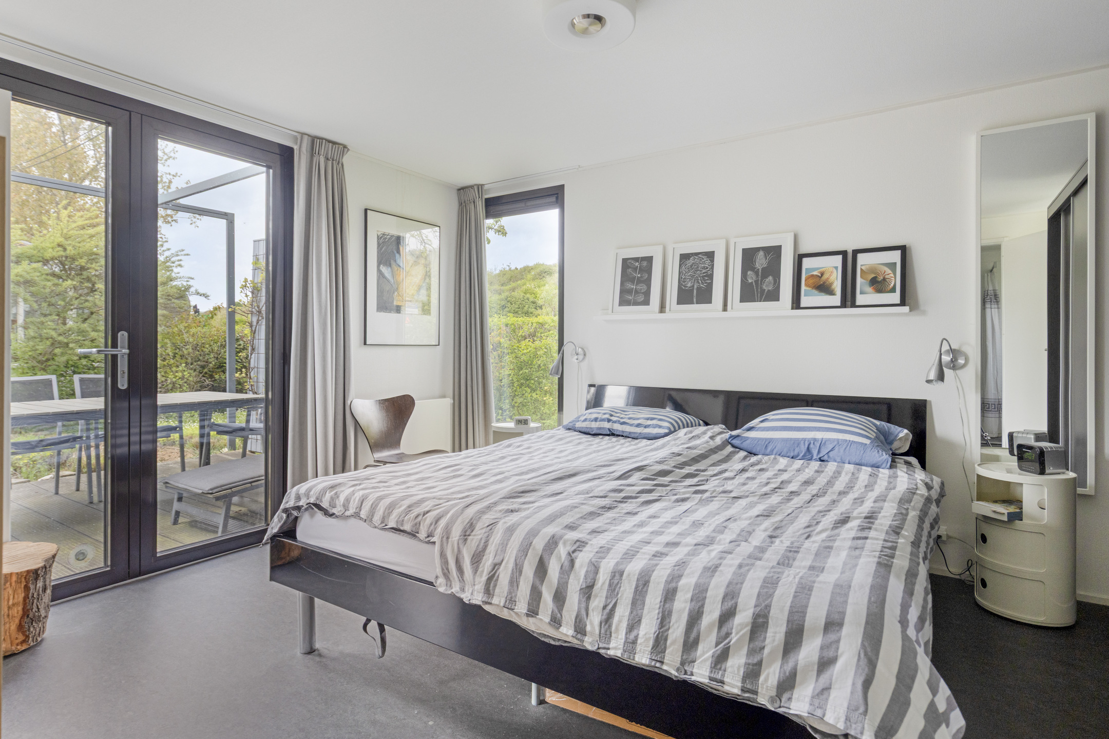 Het chalet beschikt over een royale master bedroom, voorzien van een kamerhoge vaste kastenwand en eigen openslaande tuindeuren naar het terras. De badkamer is ‘en-suite’ bereikbaar en modern uitgevoerd met een ruime inloopdouche en een elegant wastafelmeubel. Daarnaast is er een separate, keurige toiletruimte aanwezig, evenals een praktische inpandige berging met de aansluitingen voor witgoedapparatuur.