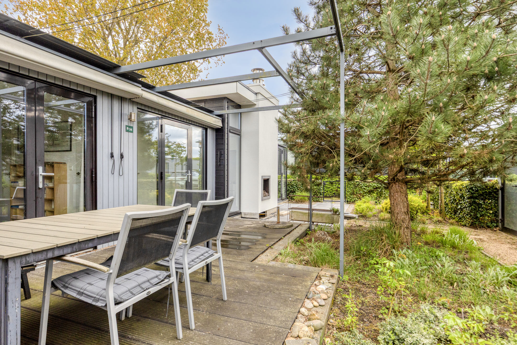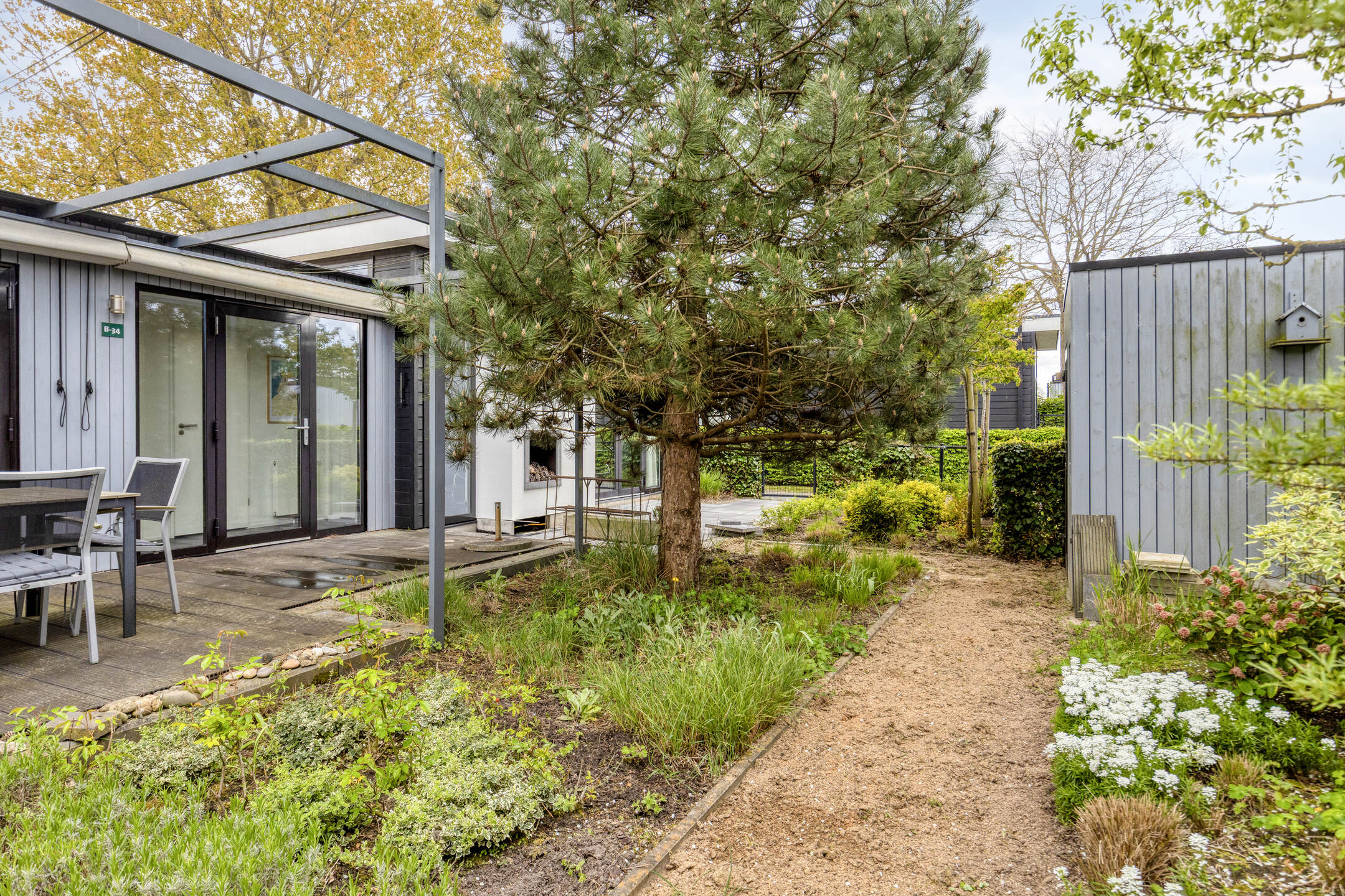 De rondom gelegen, sfeervolle tuin biedt veel privacy en zonlicht. Het verhoogde terras vormt het hart van de buitenruimte; de tegels hiervan zijn in 2025 volledig vernieuwd, wat de tuin een frisse en verzorgde uitstraling geeft. Er is meer dan voldoende ruimte voor het plaatsen van een comfortabele lounge- of eethoek. Verder beschikt de tuin over een praktisch, vrijstaand tuinhuis, wat de ideale plek is voor het veilig opbergen van fietsen, tuinmeubilair en strandspullen. Daarnaast beschikt de woning over een parkeerplaats op eigen terrein, gelegen voor het tuinhuis en extra verstevigd met een kunststofraster.