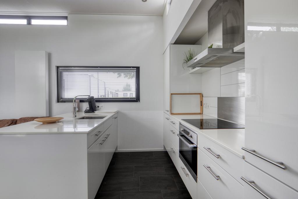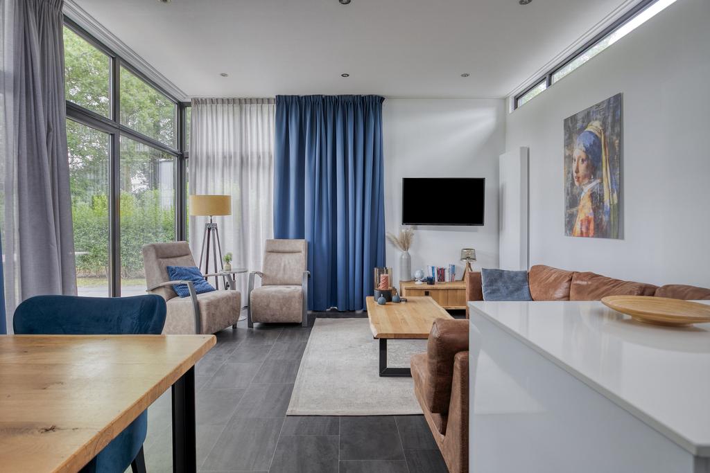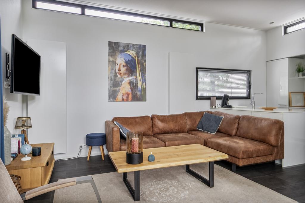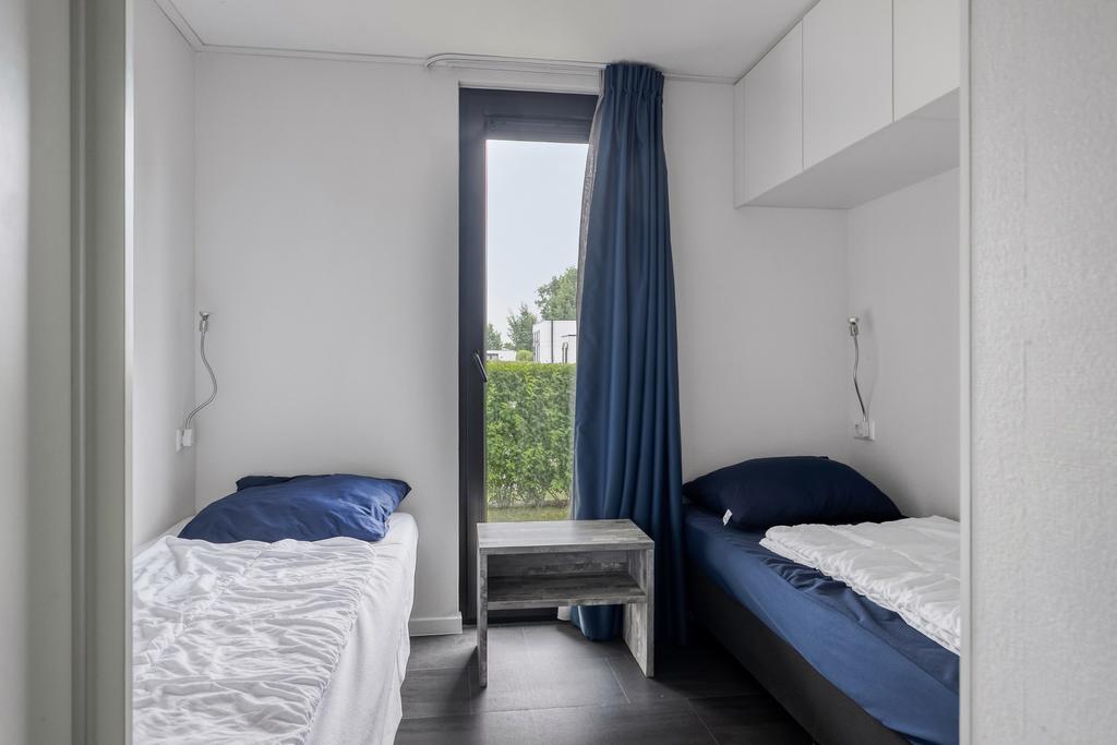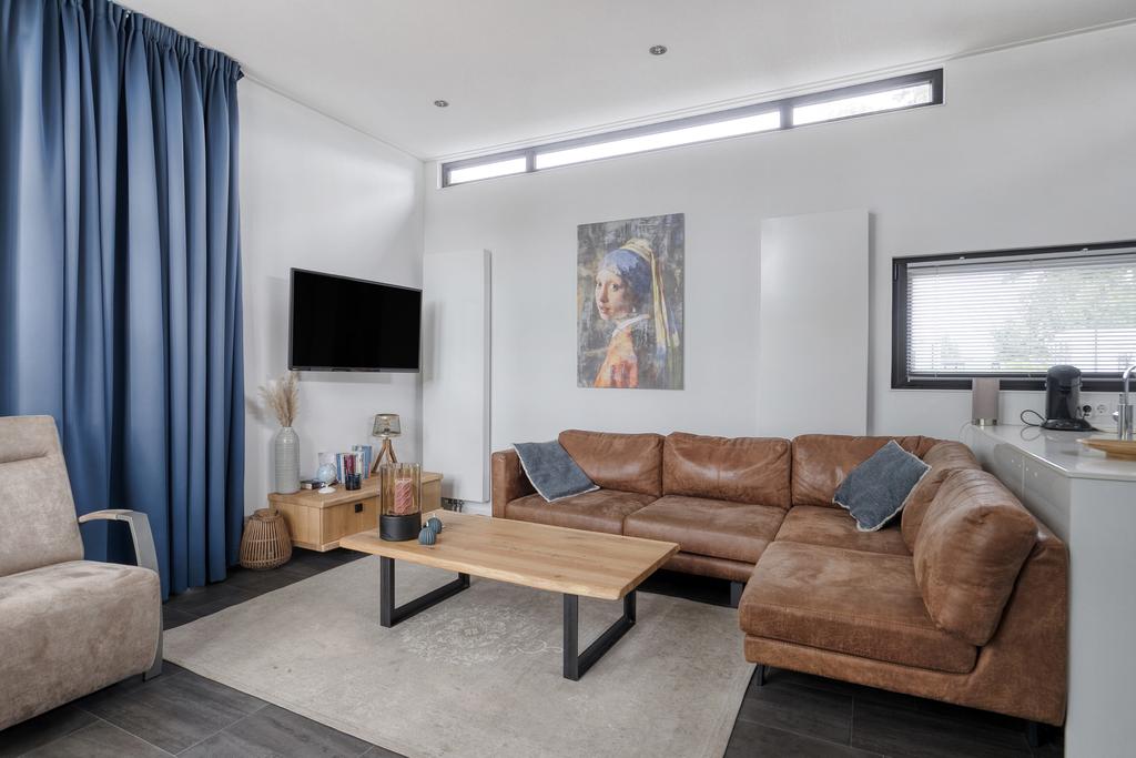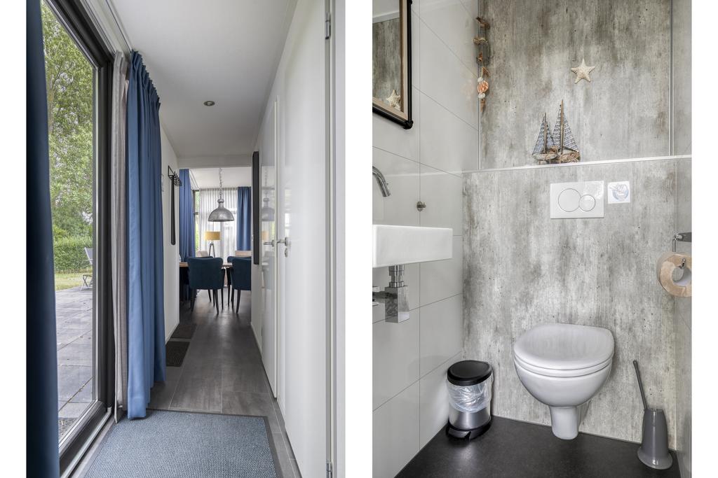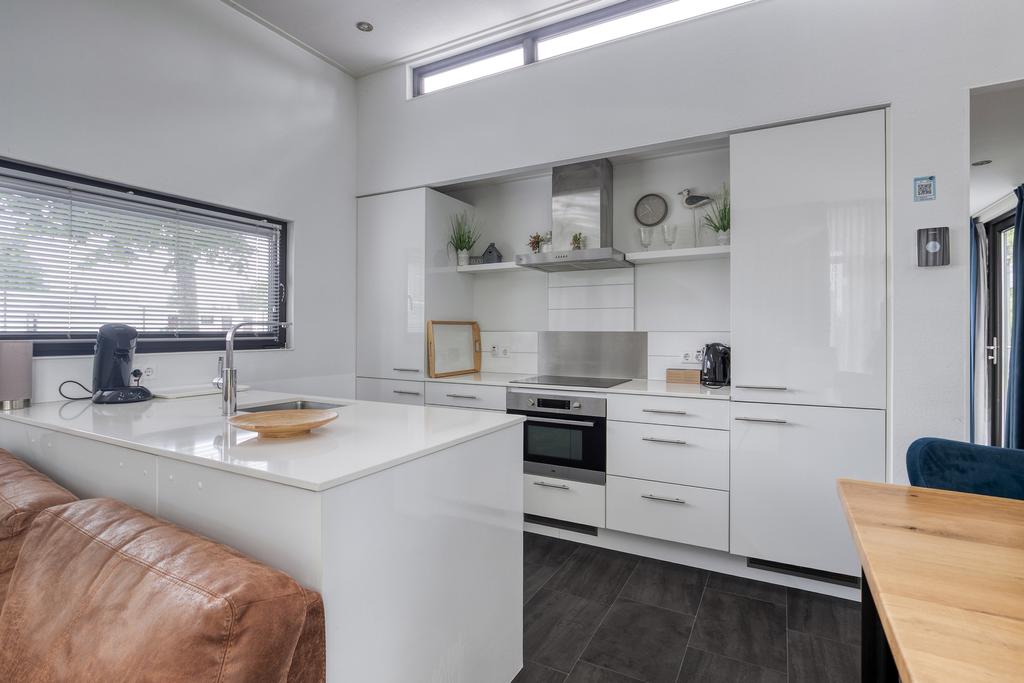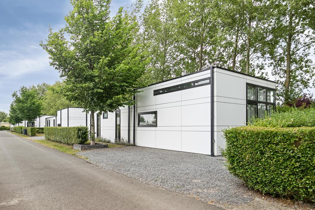 Via de entree komt u in de hal met een separate toiletruimte, voorzien van hangtoilet en fonteintje. Aan de linkerzijde bevindt zich de royale woonkamer met verhoogd plafond, elektrische sfeerhaard en schuifpui naar het terras. De moderne inbouwkeuken is uitgerust met een inductiekookplaat, afzuigkap, combi-oven, koelkast, vaatwasser en een stijlvol spoeleiland. Er zijn twee slaapkamers, waarvan één slaapkamer beschikt over een praktische vaste kast. De badkamer is voorzien van een douche, tweede toilet en een wastafelmeubel. Daarnaast beschikt het chalet over een privé berging, die desgewenst de mogelijkheid biedt tot het realiseren van een derde slaapkamer.