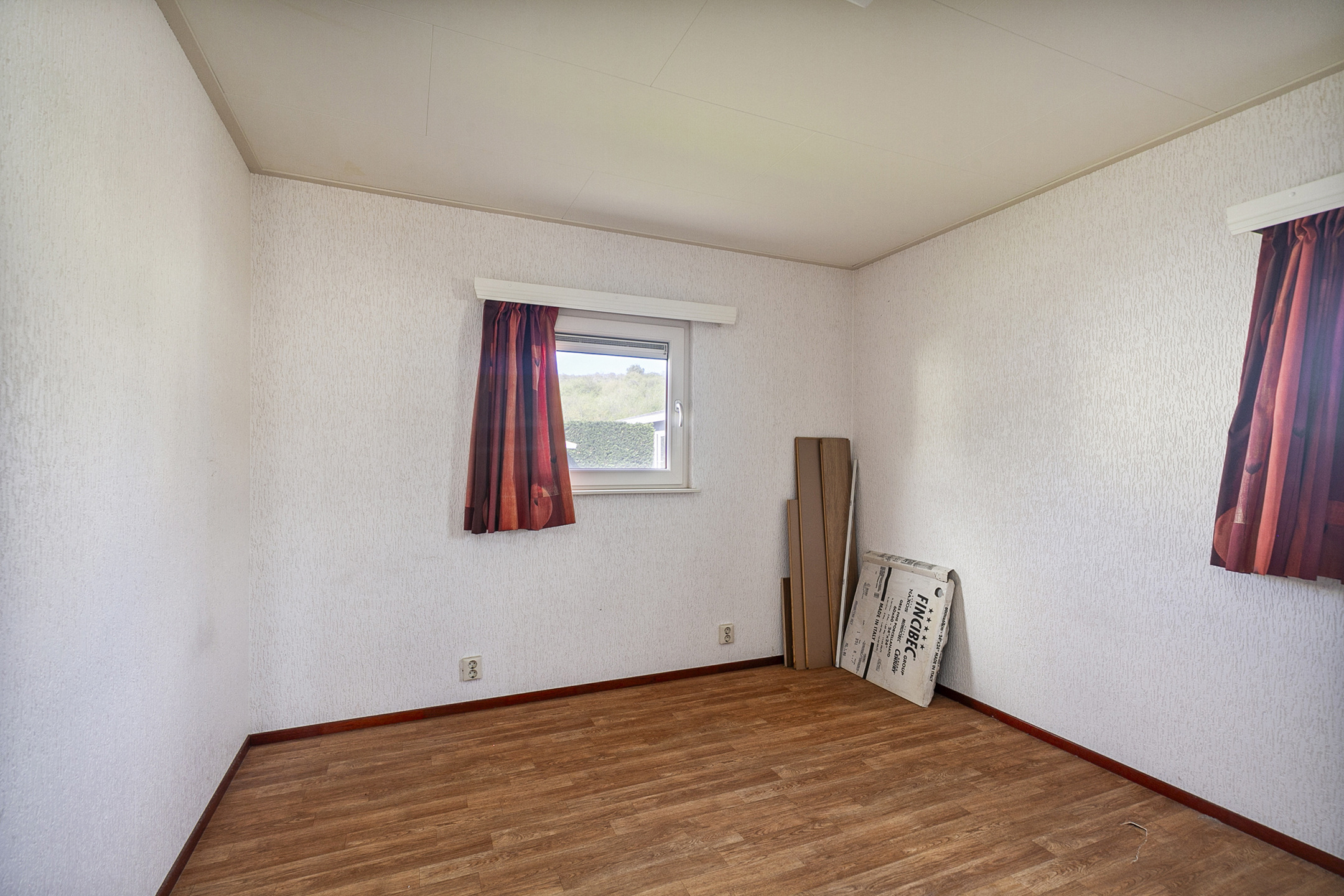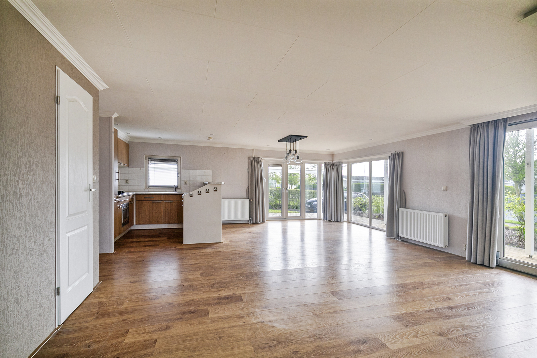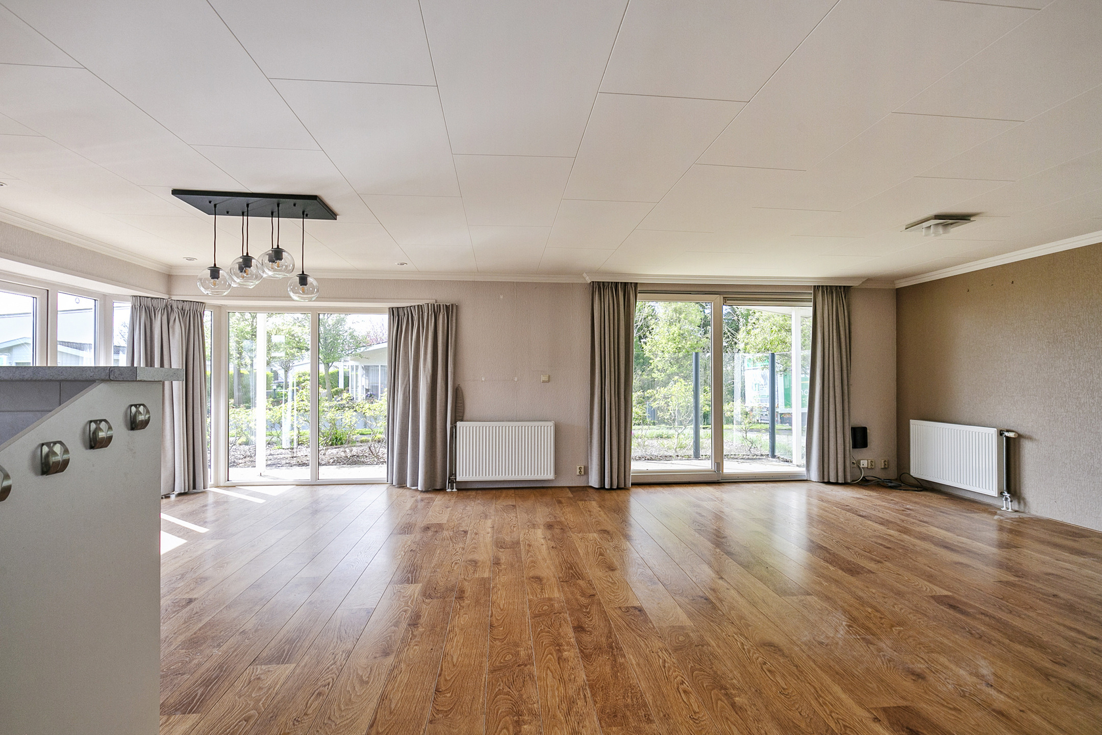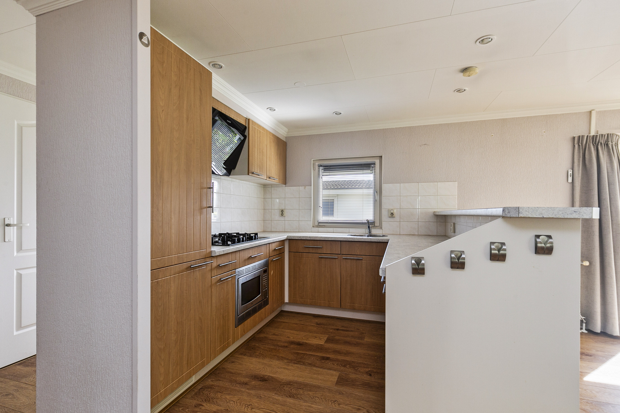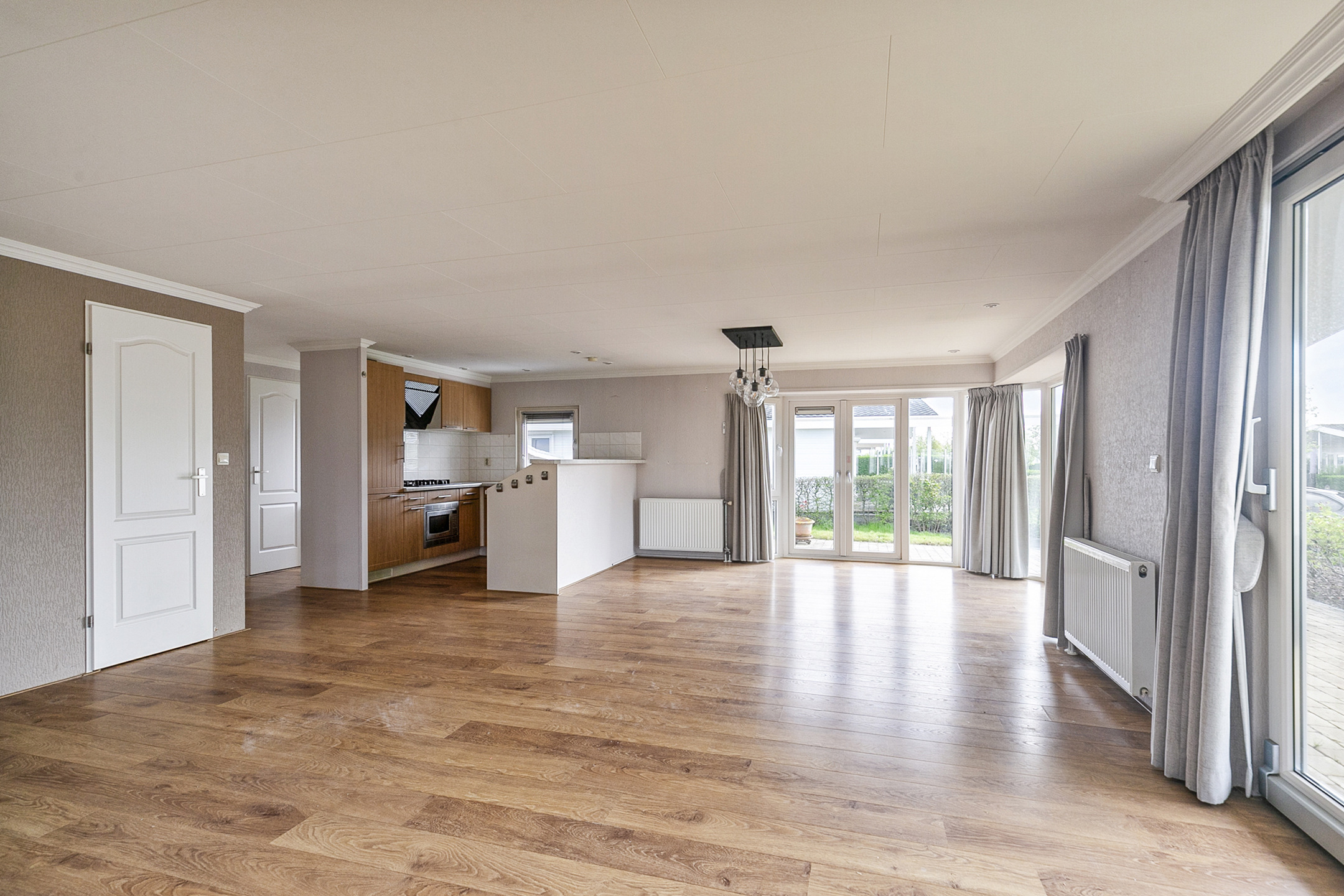 Entree in de hal met toiletruimte en cv-ruimte. Loopt u verder dan bereikt u de ruime woonkamer met open keuken voorzien van 5-pits kookplaat, combi- oven, diepvries, koelkast, vaatwasser en afzuigkap. De woonkamer beschikt tevens over openslaande tuindeuren naar het terras en grote raampartijen welke zorgen voor genoeg lichtinval. Daarnaast beschikt chalet over een hal met toegang tot de 3 slaapkamers en de badkamer met douche, wastafelmeubel en toilet.