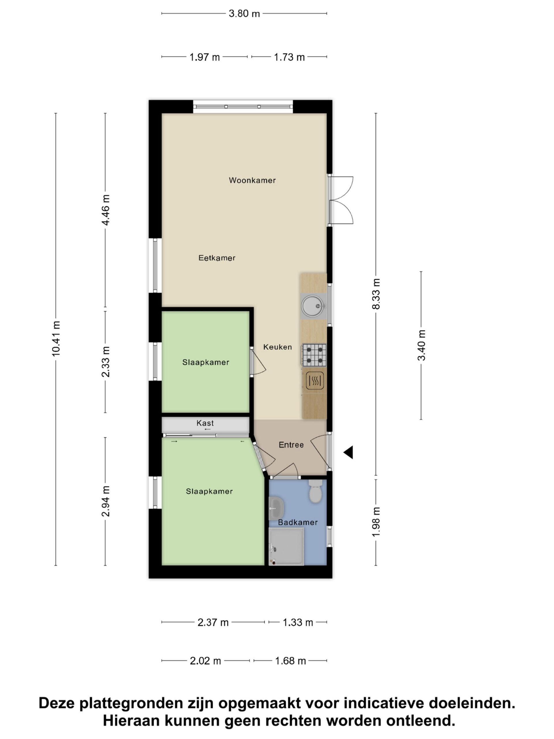 Entree in de hal met toegang tot alle vertrekken. Nette open inbouwkeuken voorzien van inbouwapparatuur zoals een 4-pitsgaskookplaat, afzuigkap, koelkast, magnetron en een vaatwasser. Aansluitend bevindt zicht de woonkamer met openslaande tuindeuren naar het terras. Verder beschikt het chalet nog over twee slaapkamers waarvan 1 met vaste kastruimte en de badkamer die is voorzien van een douche, wastafel en toilet.